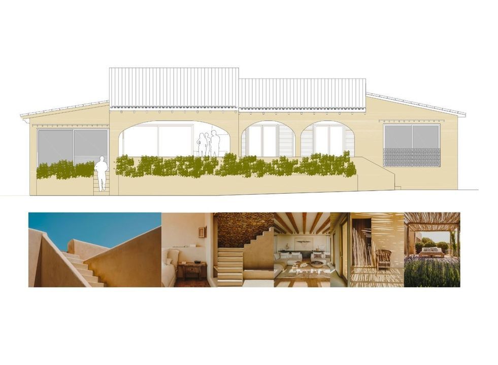 Binnen kenmerkt de villa zich door een open indeling waarin de woon- en eetruimte naadloos overgaan in de moderne keuken met kookeiland. Grote glazen schuifdeuren openen naar het overdekte terras en het zwembadgedeelte, waardoor binnen en buiten in harmonie samenkomen. Houten balken, kalkafwerking en natuurlijke texturen versterken het serene, kustkarakter van de villa.