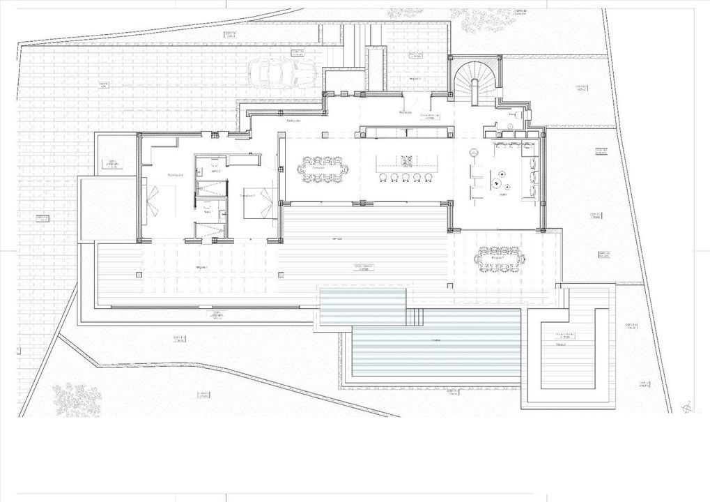 Luxe Ibiza-stijl nieuwbouwwoning in Benissa op een perceel van 1.129 m² met 374 m² bebouwde oppervlakte, panoramisch uitzicht, 4 slaapkamers met en-suite badkamers, kelder met garage, fitness, privébioscoop en wasruimte, ruime living met open woonkeuken, aparte zitkamer, master suite met vestidor, vloerverwarming, airconditioning en hoogwaardige afwerking.