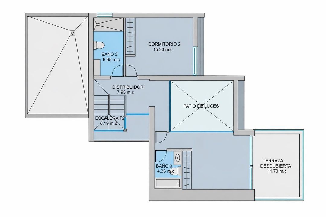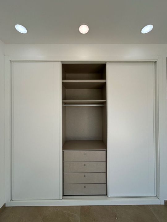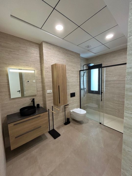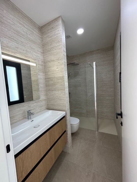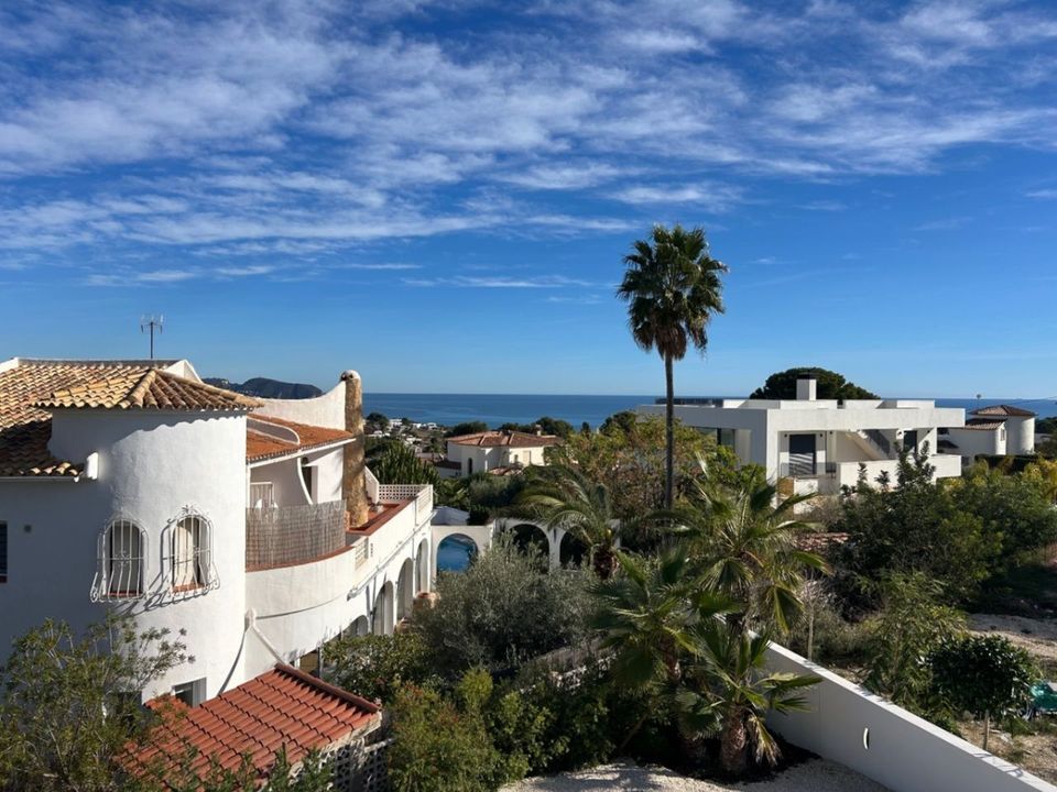 Op de begane grond bevindt zich verder een ruime slaapkamer met inbouwkasten en schuiframen naar buiten, evenals een stijlvolle badkamer met inloopdouche. Via de trap bereiken we de bovenverdieping. Hier bevindt zich nog een dubbele slaapkamer een ruime moderne badkamer. De master bedroom beschikt over een ensuite badkamer en een zeer groot terras met prachtig zeezicht, zicht op de Peñón de Ifach en uitzicht richting het centrum van Moraira.