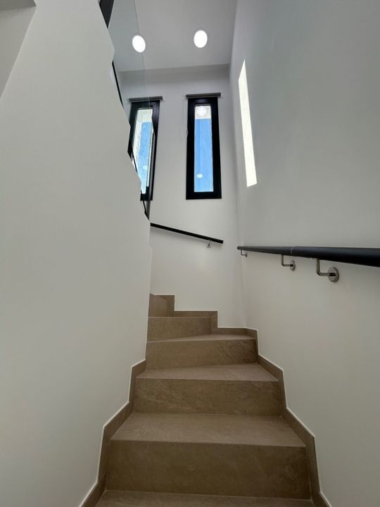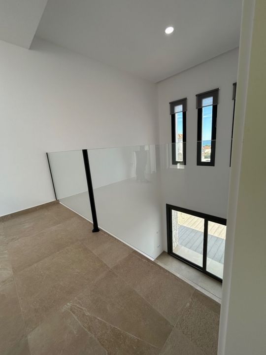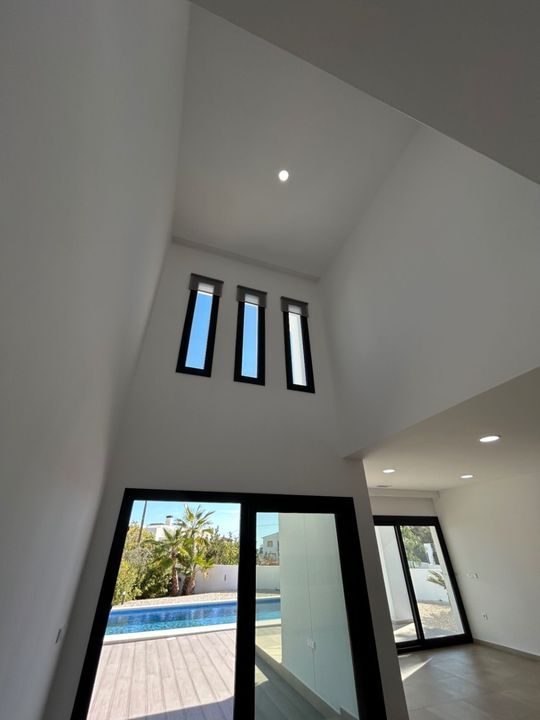 We betreden het eigendom via een automatisch gestuurde elektrische poort. Een lange oprit leidt ons naar de woning en creëert meteen een gevoel van rust, ruimte en privacy. De villa is volledig instapklaar en klaar voor haar eerste bewoners. Via de inkomhal, met aparte praktische ruimte voor wasmachine en stockage, komen we in de open woon- en eetkamer met dubbele plafondhoogte. Hier bevindt zich ook de volledig uitgeruste moderne keuken met kookeiland, waar men comfortabel kan zitten met barkrukken. Grote driedelige schuiframen zorgen voor veel lichtinval en geven directe toegang tot de terrassen, deels overdekt en deels open, zodat u de hele dag kan genieten van het mediterrane klimaat.