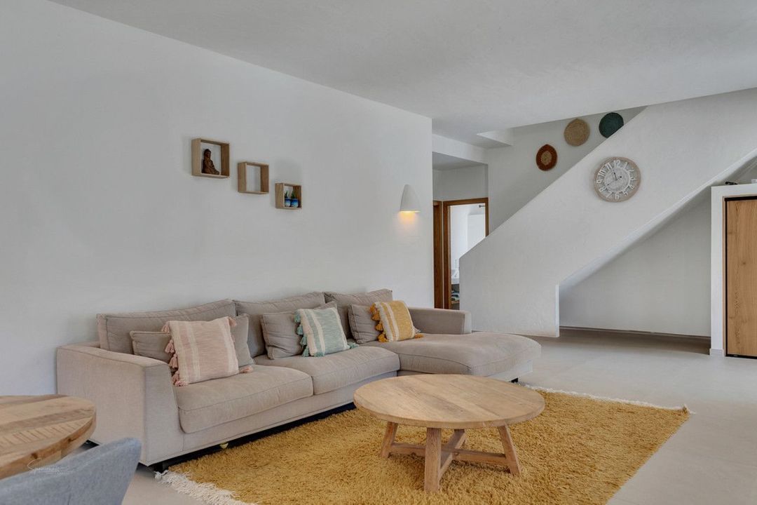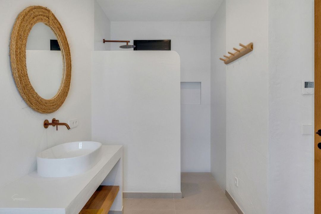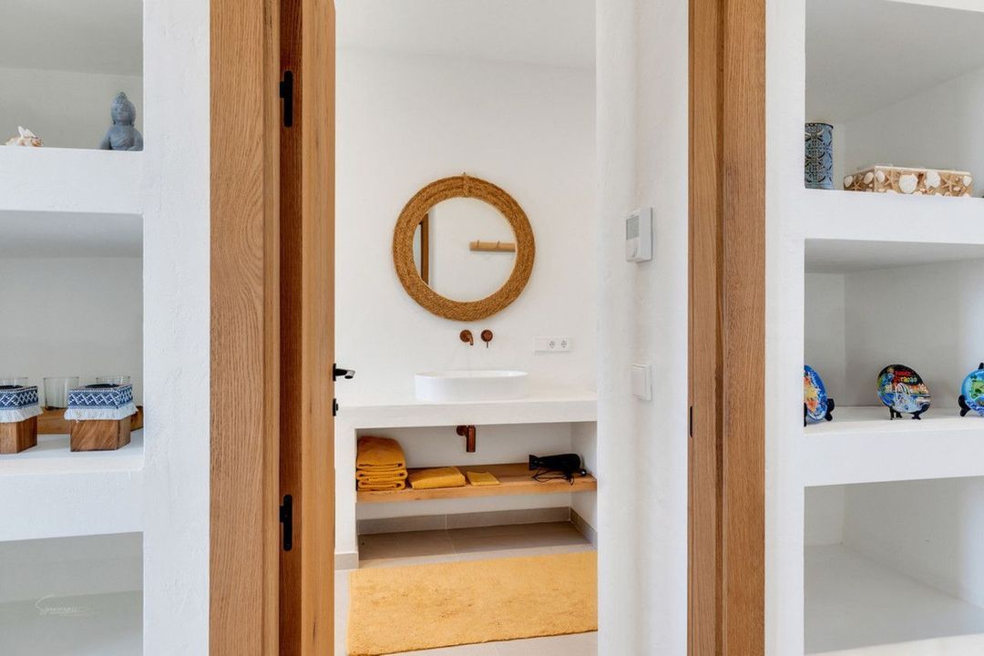 The interior design and presentation is both contemporary and rustic, offering stylish luxury and comfort. The main floor includes an open-plan living and dining room, complete with a modern Ibiza-style kitchen. Additionally, there are three double bedrooms, one with ensuite bathroom, and a family bathroom on this floor.