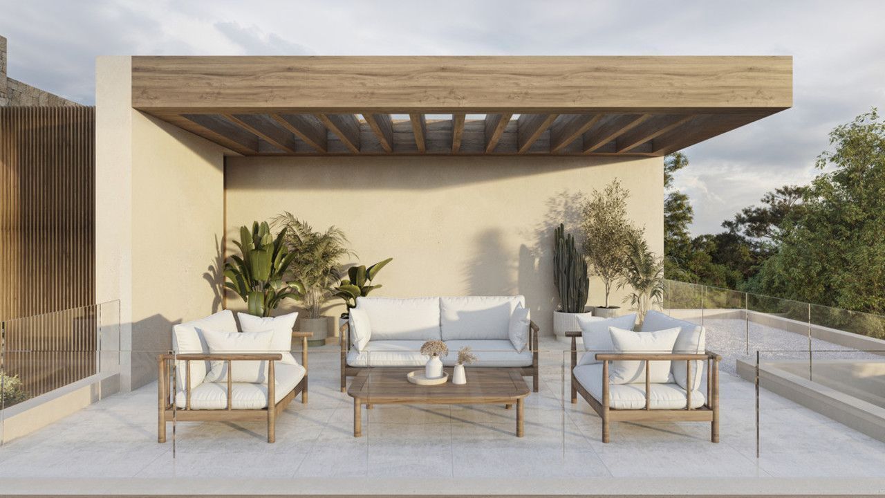 Geniet van panoramisch zeezicht door ramen van vloer tot plafond, naadloze overgang tussen binnen en buiten, en luxe afwerkingen in steen, hout en zachte neutrale tonen. Het buitenleven wordt verhoogd met een infinity-zwembad, zonneterrassen en een stijlvolle overdekte eetruimte onder een houten pergola.