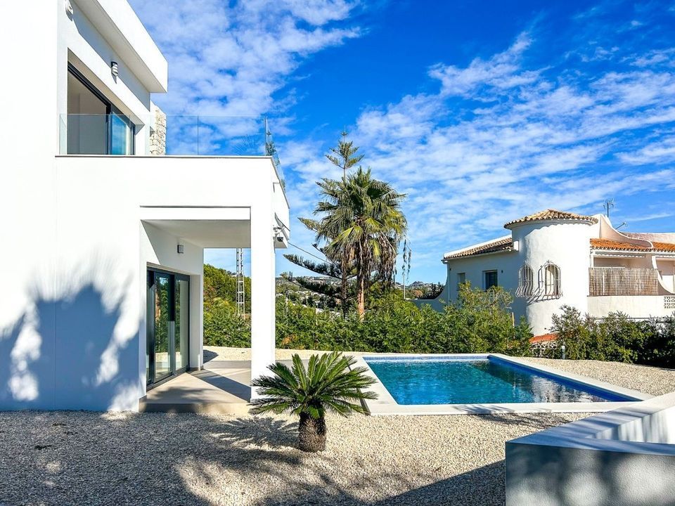 Moderne villa in Benissa, gebouwd in 2025, op het zuiden gericht met uitzicht op zee vanuit de bovenverdieping. Gelegen op 5 km van het stadscentrum en 1,2 km van de zee.