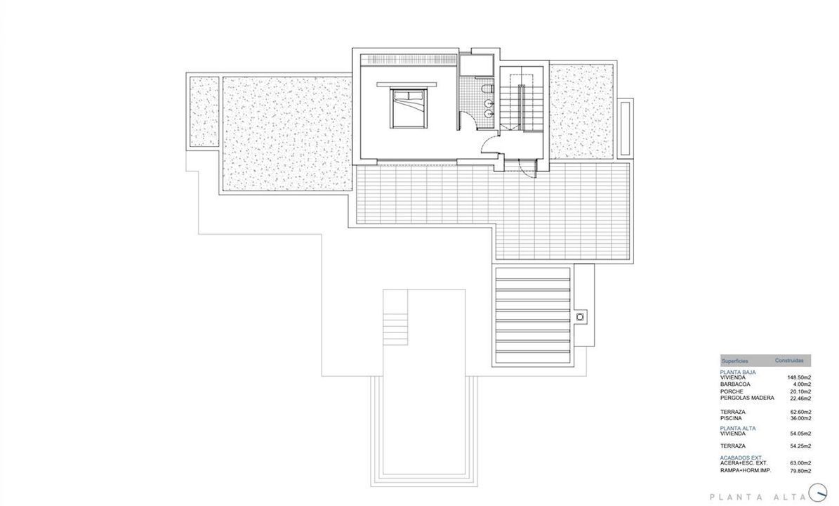 Op de bovenverdieping biedt de masterbedroom maximale privacy en comfort. Deze ruime suite heeft een en-suite badkamer en een privéterras met uitzicht op zee, waardoor het de perfecte plek is om wakker te worden en te ontspannen terwijl je uitkijkt op de Middellandse Zee.