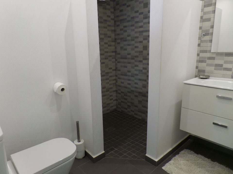 The main level includes a spacious living room, a glazed terrace, a separate fully equipped kitchen, three bedrooms, and two bathrooms. The lower level offers an open plan kitchen/ living and dining area, two bedrooms, a bathroom, an additional guest WC and direct access to the pool area.