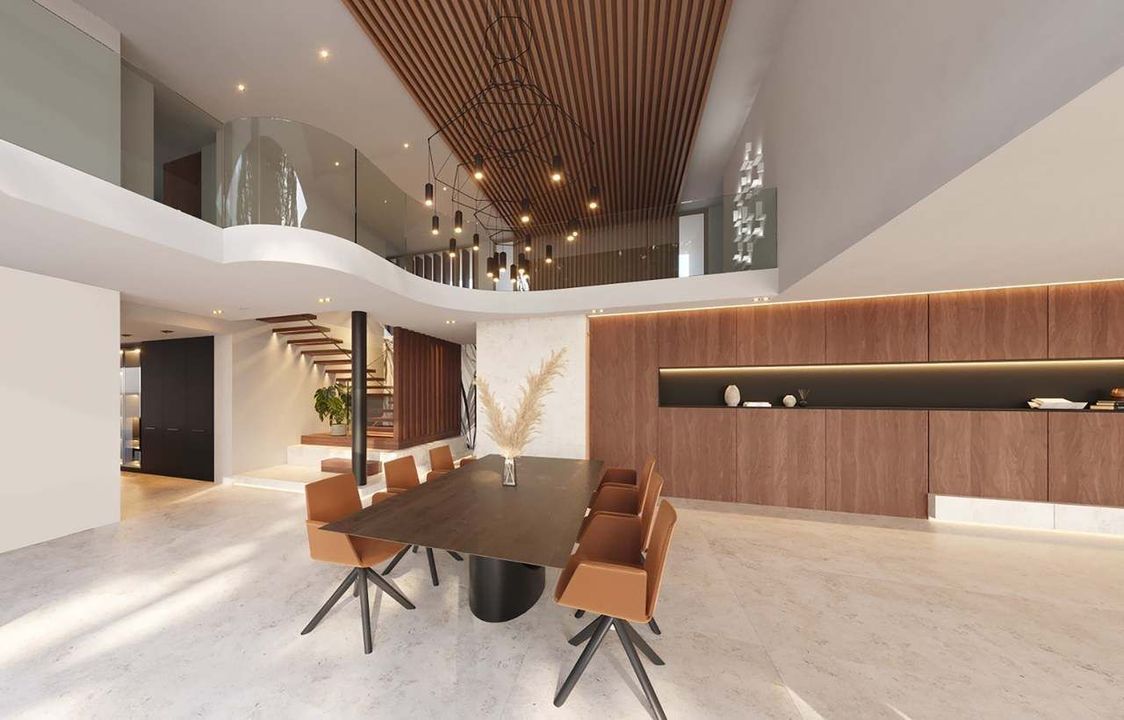 Er zijn drie verdiepingen in de woning met in totaal 5 slaapkamers en 9 badkamers. Op de hoofdverdieping zijn een ruim salon en eetkamer met een open design keuken met kookeiland, afgewerkt met notenhout en antraciet. Op dit niveau bevindt zich ook de hoofdsuite met dressing, eigen badkamer en rechtstreekse toegang tot het terras. Op de bovenverdieping zijn er drie slaapkamers met en-suite badkamer en privé terrassen, voor het comfort van de gasten. De benedenverdieping is voorzien voor vrije tijd en relax, met een bioscoop en surround sound- systeem, fitnessruimte, overdekt zwembad, sauna en hammam. Er is ook nog een appartement voor gasten, uitgerust met een keuken, salon en slaapkamer met privé badkamer.
