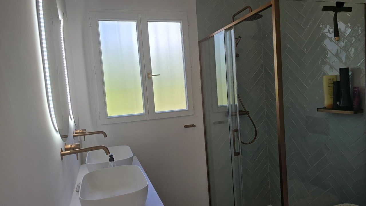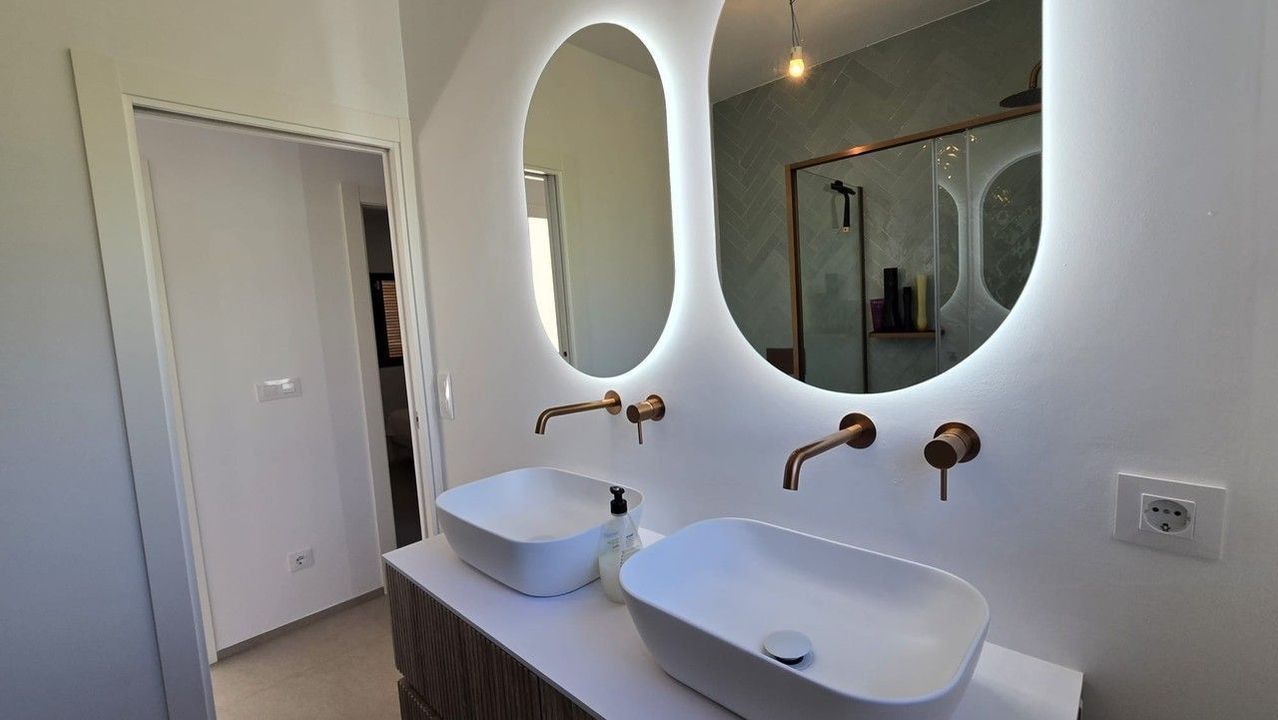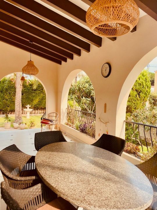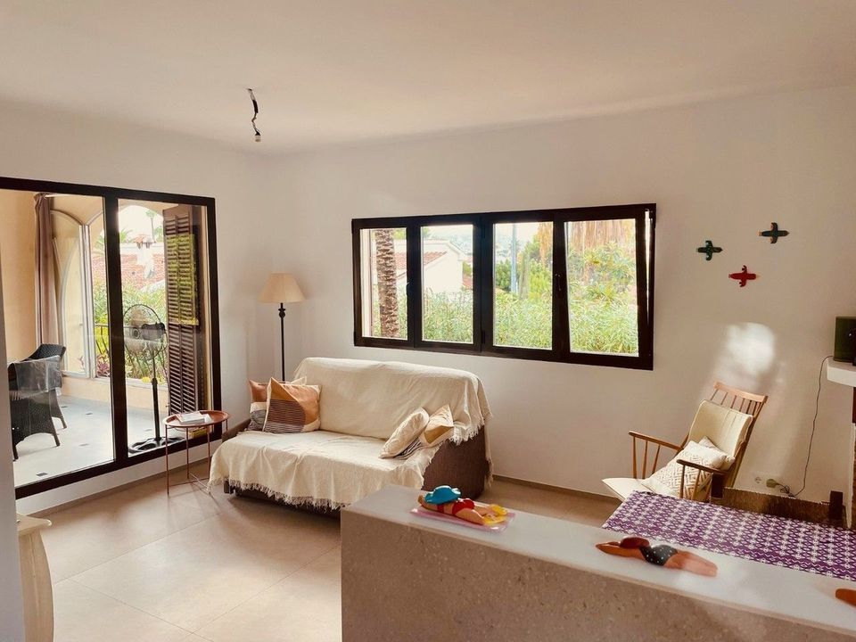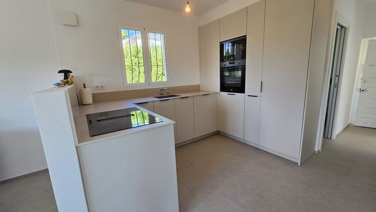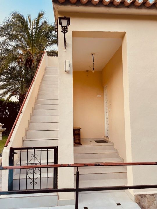 This beautifully renovated villa combines modern comfort with Mediterranean charm. The main floor, which measures 110 square meters, offers a spacious living and dining area with an open-plan layout. The newly designed kitchen is custom-made, featuring a stone countertop and integrated appliances. There is also a modern bathroom equipped with an Italian shower and double sink, as well as two comfortable bedrooms. From this level, you can access a covered terrace, perfect for relaxing and enjoying the outdoor lifestyle.