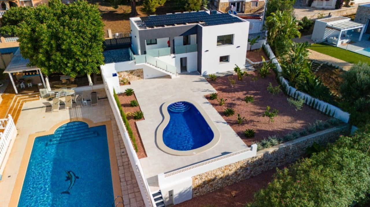 Moderne zuidgerichte villa te koop in Los Pinos, Calpe – met twee onafhankelijke appartementen, zwembad en zonne-energiesysteemOntdek deze prachtig gerenoveerde vrijstaande villa, ideaal gelegen in een rustige doodlopende straat in de gewilde wijk Los Pinos in Calpe. De woning bevindt zich op een volledig vlak en zuidgericht perceel, op korte afstand van het centrum van Calpe, het strand van La Fustera en alle voorzieningen die de kust te bieden heeft.
