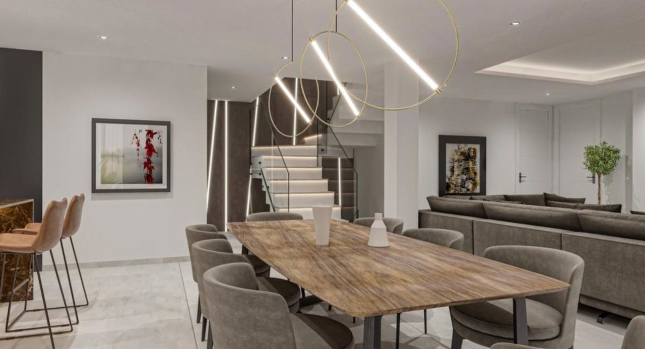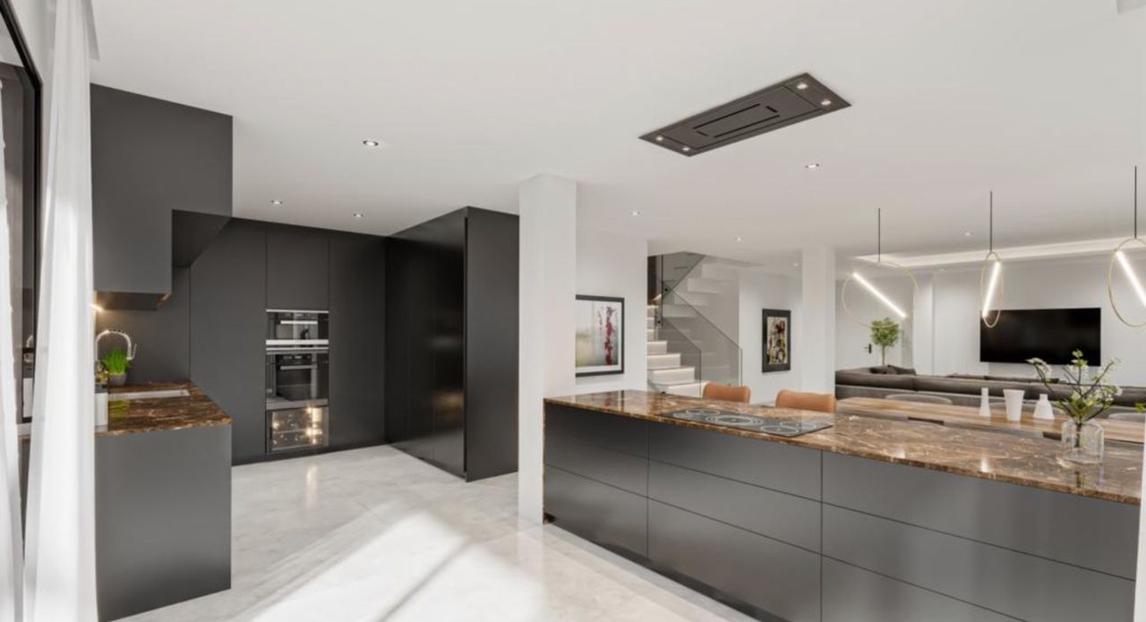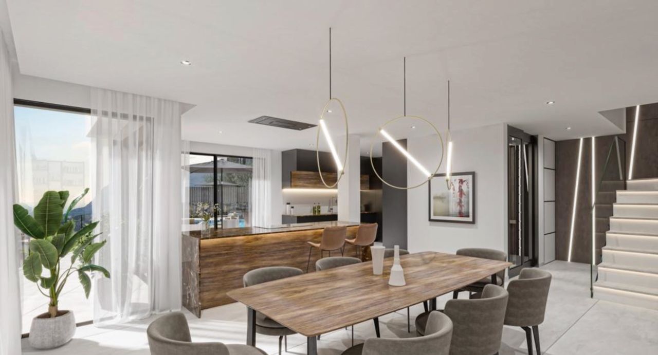 Binnen biedt de woning vier slaapkamers en vijf badkamers, wat zorgt voor voldoende ruimte en privacy voor zowel het gezin als gasten. De open keuken vormt het hart van het huis en sluit naadloos aan op de ruime woonkamer, waar grote ramen een panoramisch uitzicht en veel natuurlijk licht binnenlaten.