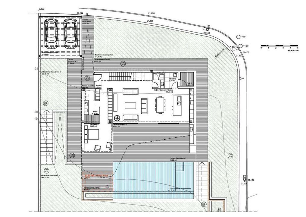 Op de begane grond bevindt zich een grote open ruimte (57,45m2) bestaande uit de woon-eetkamer en de volledig uitgeruste moderne keuken. Op deze verdieping is er ook een ruime slaapkamer (24m2) met en-suite badkamer, een gastentoilet en aangrenzend aan de keuken een wasruimte. Buiten is er een prachtig overloopzwembad van 59,55m2, een veranda met geïntegreerde barbecue en een open terras om van de zon te genieten.