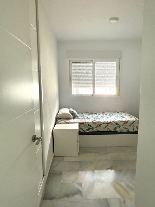 Inside, the property combines brightness and generous spaces with a modern and functional design. The living-dining room connects seamlessly with a designer kitchen fully fitted and separated by an elegant peninsula. The home offers three bedrooms, all with natural light and built-in wardrobes: