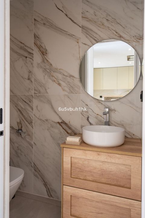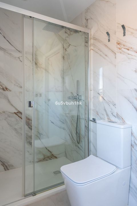 A staircase with led lights and sensors leads up to the first floor with two ensuite bedrooms. The first bedroom is large with plenty of built in wardrobes and a terrace with stunning sea views. The ensuite bathroom is stylish and a perfect size. The second bedroom also has built in wardrobes and a modern bathroom.