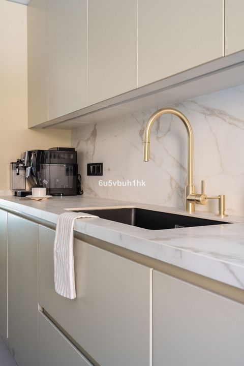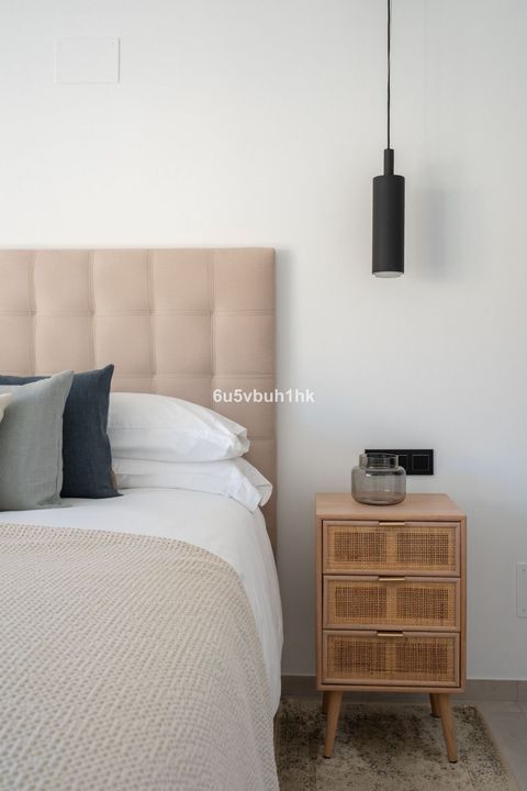 The impressive front door leads into an open plan kitchen and living room area which flows out onto a private patio with direct views to the sea and a gate to the community area. The kitchen is fitted with modern appliances and is ample in size with plenty of storage space.