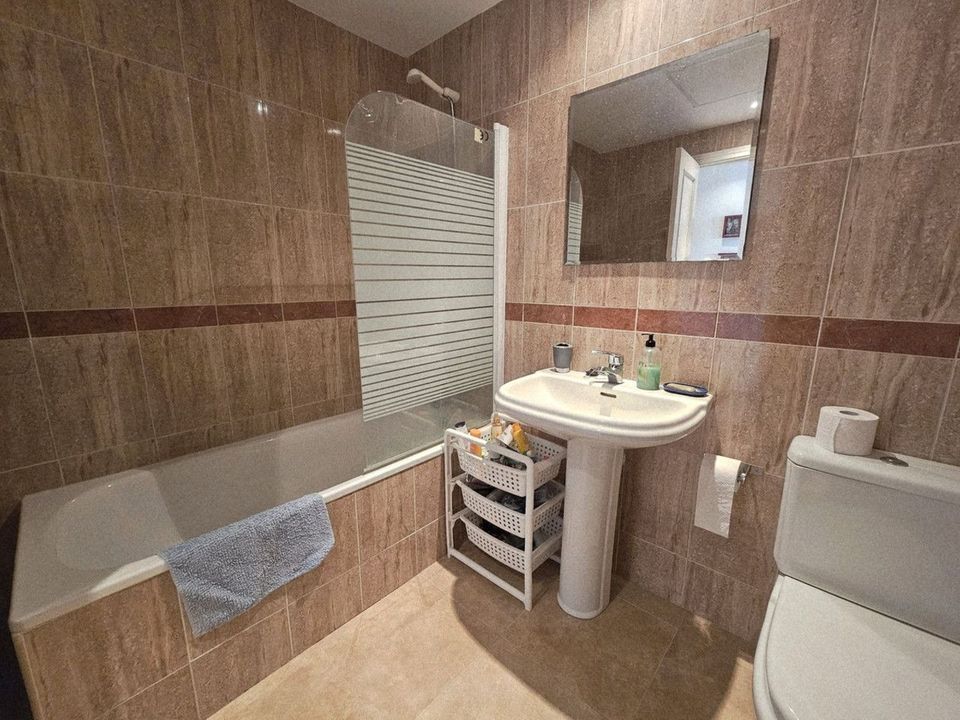 Dit appartement, dat uitsluitend als vakantiehuis wordt gebruikt, verkeert in goede staat en is direct te betrekken. De gastvrije hal leidt naar een volledig ingerichte keuken met een charmant uitzicht op de golfbaan en een praktische bijkeuken. De woon-/eetkamer komt uit op het grote onoverdekte terras met uitzicht op de zwembaden, de tuinen en de Middellandse Zee. De hoofdslaapkamer, compleet met en-suite badkamer, heeft ook directe toegang tot het terras. Twee extra slaapkamers delen een complete familiebadkamer en alle slaapkamers zijn door een gang gescheiden van de woonkamer, wat rust en stilte garandeert voor familie of gasten. De beveiligde community biedt uitstekende faciliteiten, waaronder twee zwembaden (één voor kinderen), een paddle-tennisbaan, aangelegde tuinen en ligt ook vlakbij een klein waterspeelpark voor kinderen – ideaal voor gezinnen. Het bruisende centrum van Sabinillas biedt alles wat u nodig heeft: tal van winkels, restaurants en alle voorzieningen op slechts een korte loopafstand.