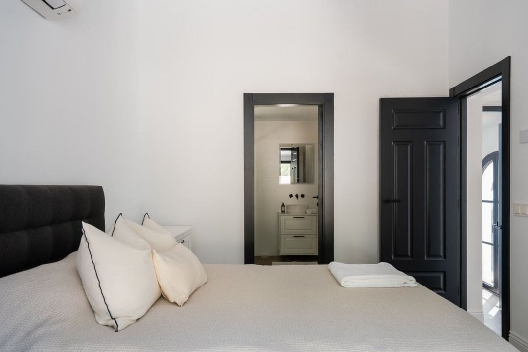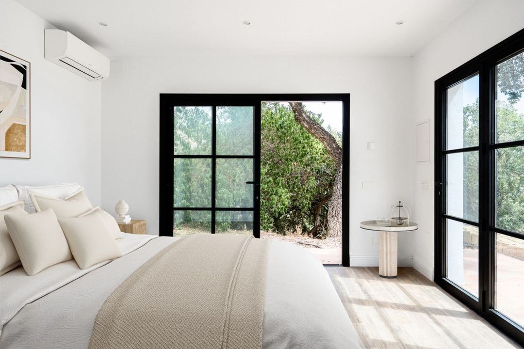A separate studio with its own bathroom offers endless possibilities—as staff accommodation, a guest house, private office, or creative retreat. Every detail has been carefully renewed, from the underfloor heating with Daikin heat pump to the individual air-conditioning, wooden-effect tiles, Villeroy & Boch bathrooms, Tres fixtures, and the Vela bathtub. The home is equipped with double-glazed aluminum windows, a fully automated home and surveillance system, and brand-new plumbing and electricity, all connected to mains services.