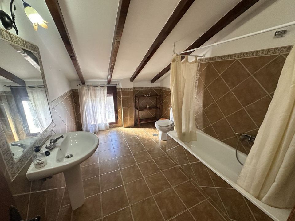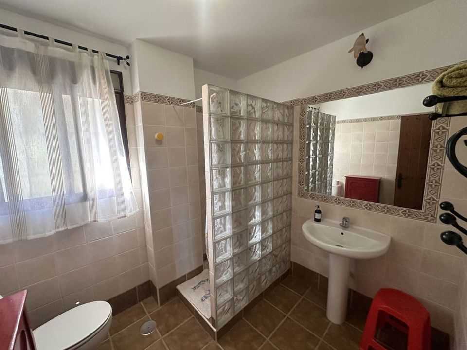 De woning beschikt over zes slaapkamers en twee badkamers, een ruime woon- en eetkamer met open haard, en een grote keuken met directe toegang tot het terras. Daarnaast is er een aparte bijkeuken voor extra praktische bergruimte.