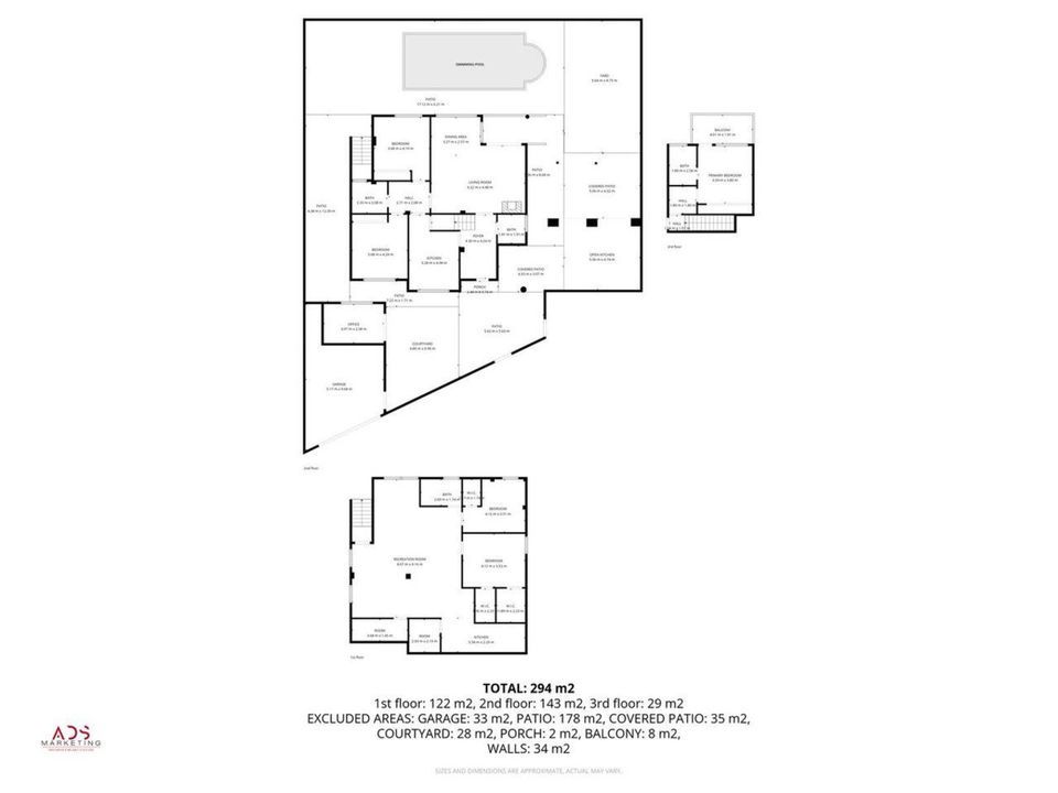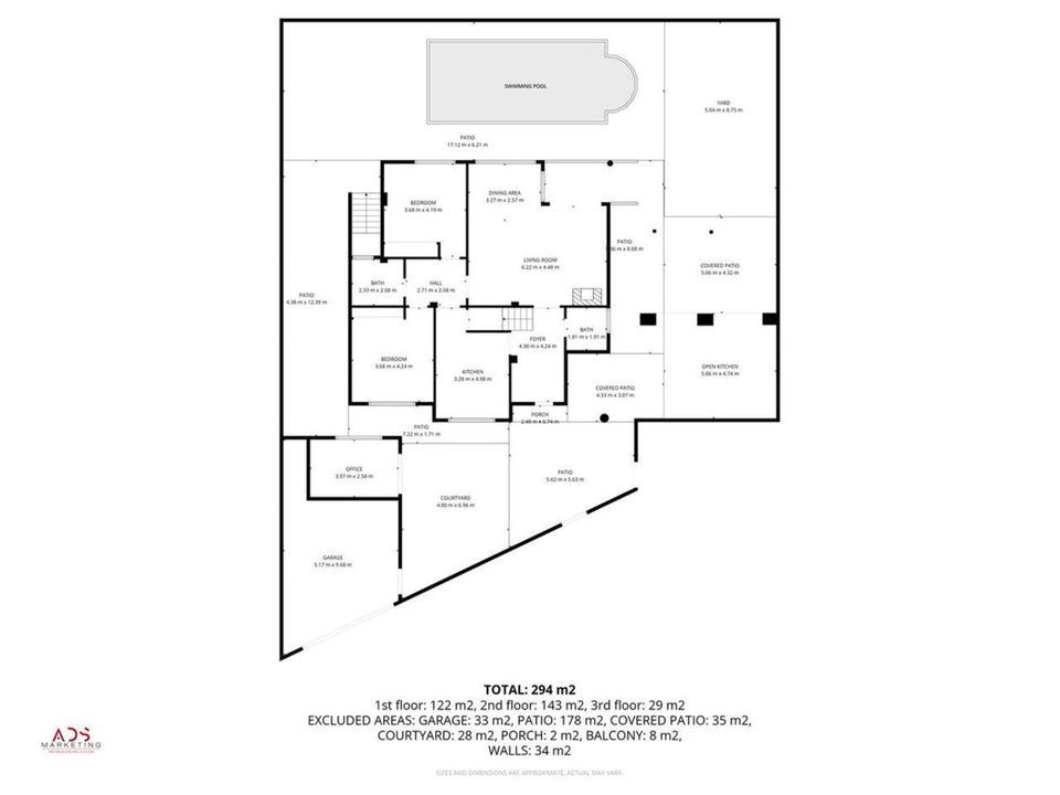 The garden surrounds a private swimming pool and offers multiple spaces for relaxing, dining, and socialising.