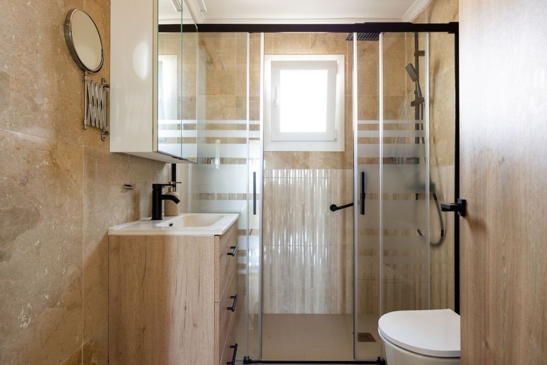 Inside, the property features a high-end designer kitchen with Neff appliances and Silestone countertops, marble flooring, air conditioning, a pellet fireplace, double-glazed windows, and a security entrance door for added peace of mind. Both bedrooms include fitted wardrobes, while the master bedroom benefits from a modern ensuite bathroom with a walk-in shower.