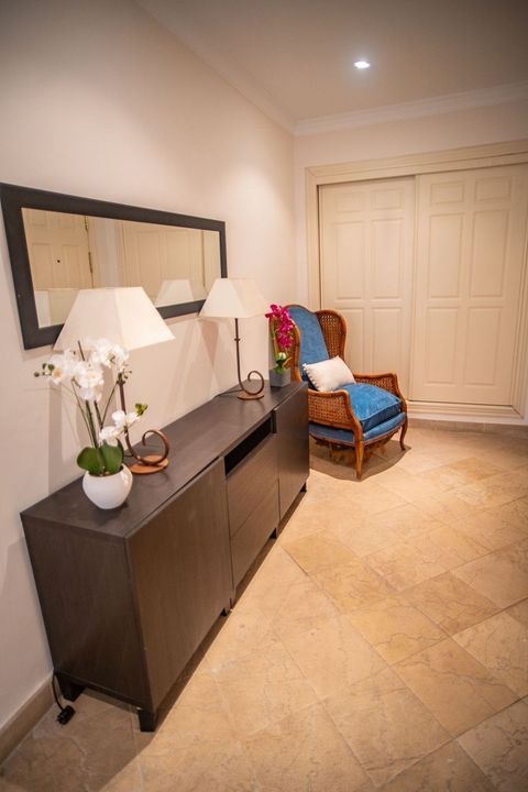 It features a spacious, large living room, perfect for relaxing or entertaining. Its south-facing layout offers panoramic views of the sea and the communal pool and garden. From here, you can access the private terrace for unforgettable moments al fresco.