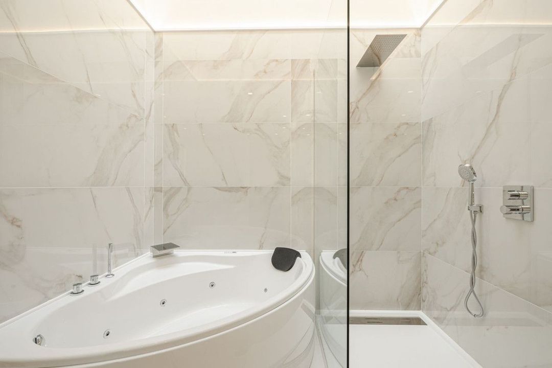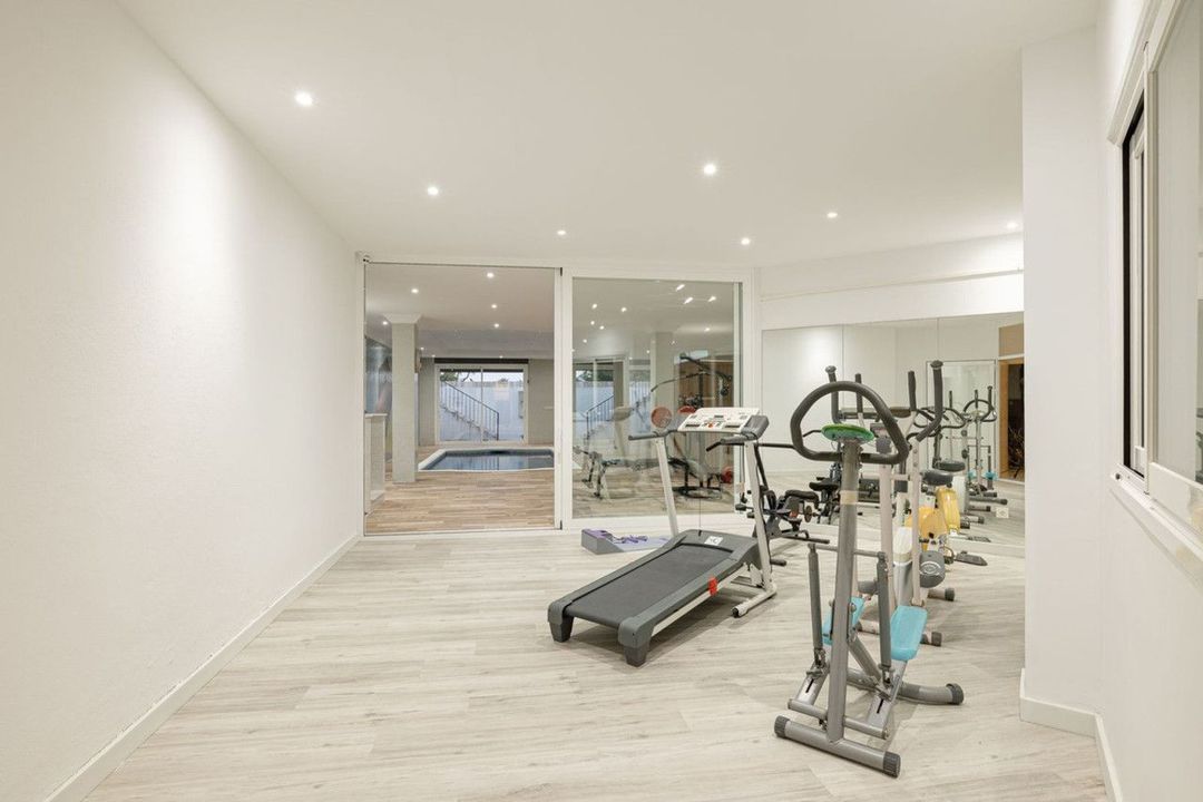 De buitenruimte is werkelijk spectaculair, met een groot zwembad voorzien van een strandachtige ingang, wat een resortgevoel oproept. Binnen biedt de villa een verwarmd zwembad, aangevuld met een luxe spa en een volledig uitgeruste fitnessruimte, waardoor het een perfecte plek is voor ontspanning en welzijn.