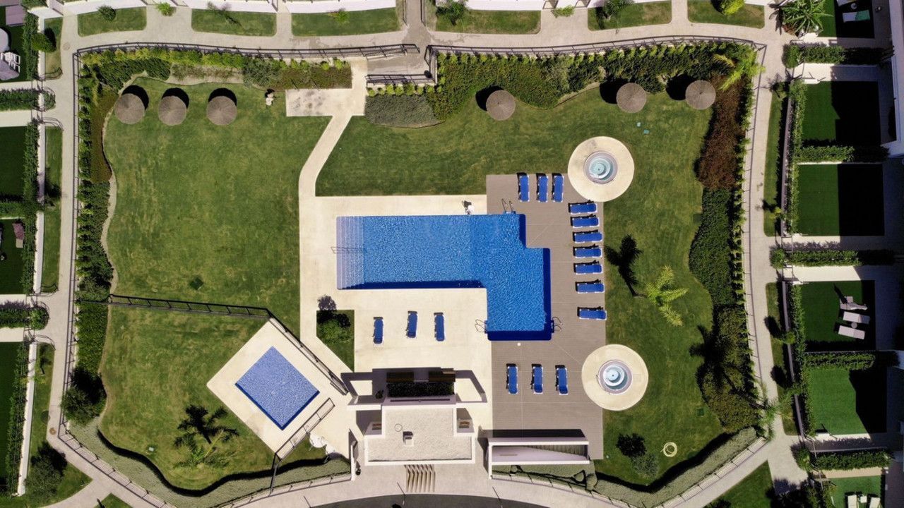The bright open-plan living and dining area flows naturally to the west-facing terrace and private garden, creating a seamless connection between indoor comfort and outdoor leisure. Floor-to-ceiling windows fill the space with natural light and frame beautiful views to the communal gardens and swimming pools. Premium specifications include underfloor heating throughout, central A/C, an advanced heat pump system, ultra-fast fiber internet, and tasteful furnishings that exude modern sophistication.