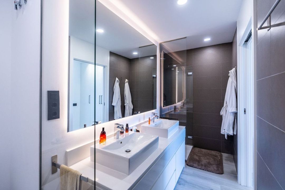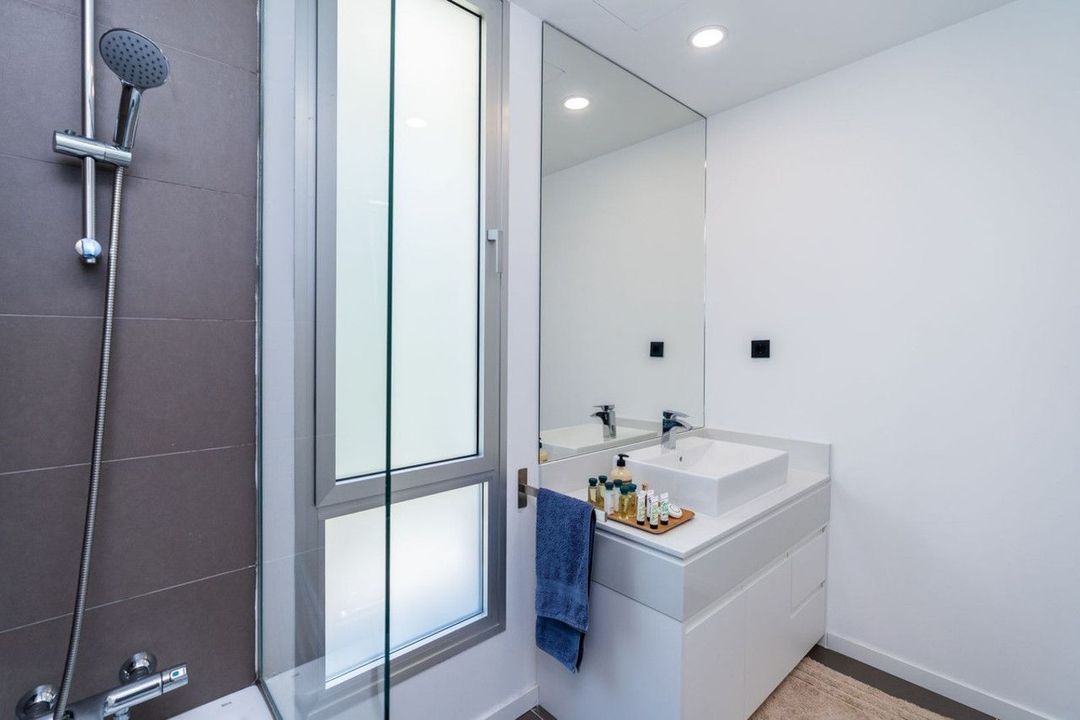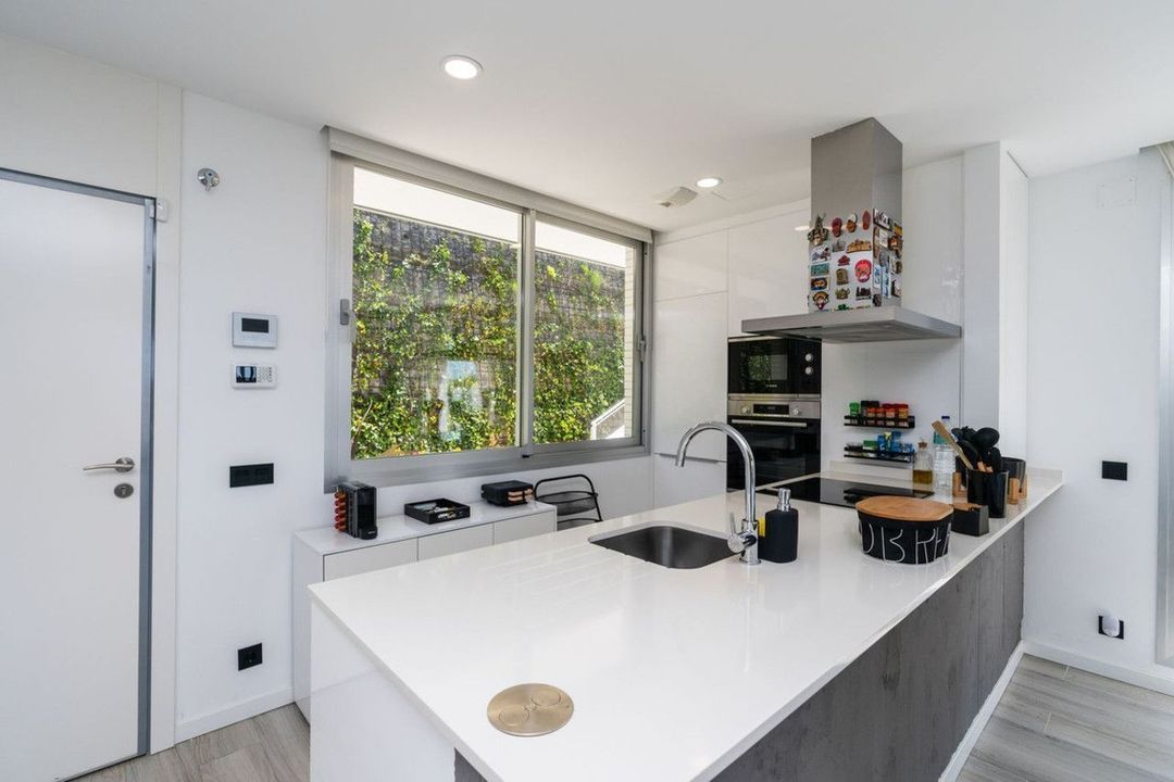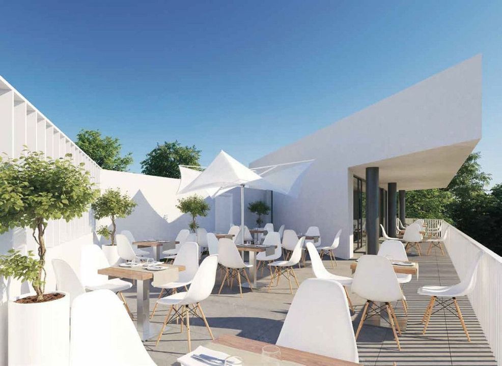 On the top floor, the fully furnished solarium is ideal for enjoying evenings under the stars or sunsets with panoramic views. Equipped with a retractable awning, and pre-installed water and electrical connections, it's ready for an outdoor kitchen or chill-out area.