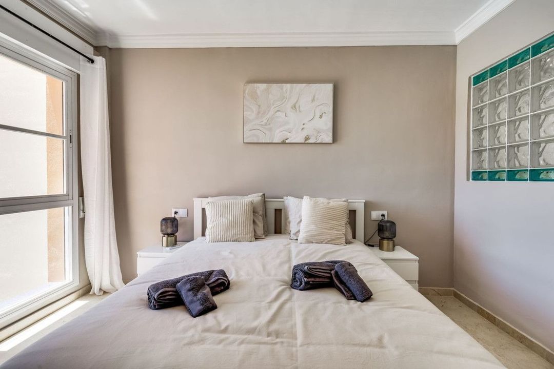 Dit complex bestaat uit een L-vormig blok met uitzicht op het zwembad en de prachtig onderhouden gemeenschappelijke tuinen. Het appartement beschikt over ruime woonruimtes met twee slaapkamers en twee badkamers, waarvan één en-suite. Deze woning heeft ook een ruim terras met vrij uitzicht op de gemeenschappelijke tuin en zwembaden, en gedeeltelijk uitzicht op zee. Bij de woning hoort een ondergrondse parkeerplaats.