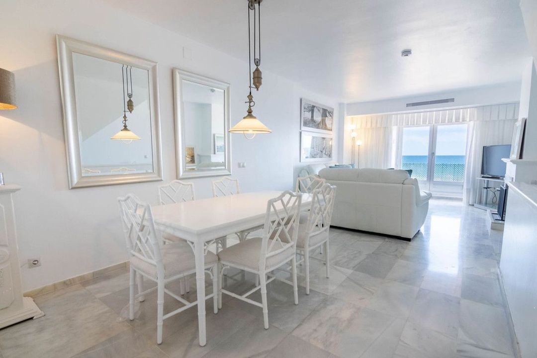 As you step inside, a fully fitted kitchen welcomes you, leading into a vast, open-plan lounge and dining area adorned with elegant white marble floors, a cozy fireplace, and expansive patio windows. These open onto a charming terrace that boasts breathtaking panoramic views of the sea and Estepona Marina—a perfect spot for enjoying the best of outdoor living with sun all day long.