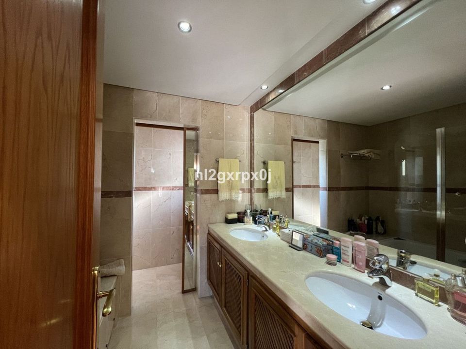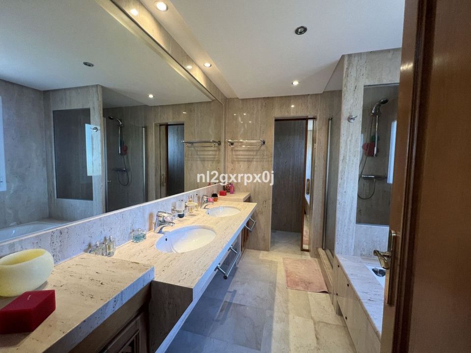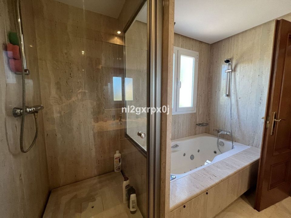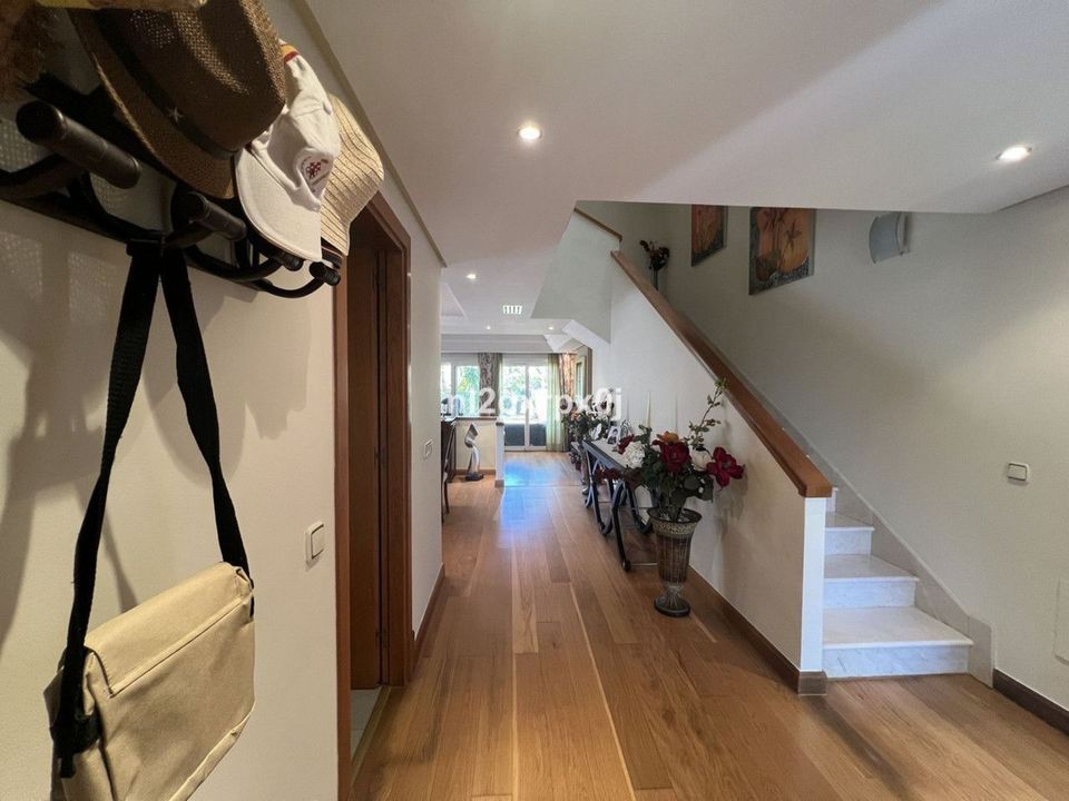 It comprises 3 bedrooms, 3 en-suite bathrooms plus a guest toilet, and has a total built area of 337 m² spread over three floors. The master bedroom has a large, very private terrace, as the house is on a corner and has only one neighbor to the right. In addition, there is a private garden of approximately 200 m², ideal for barbecues and maintained by the community. The property also includes a large garage for 8 vehicles, electric boiler and underfloor heating throughout, as well as centralized and split air conditioning units.