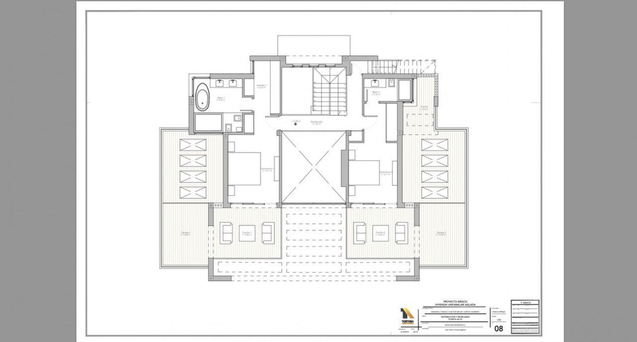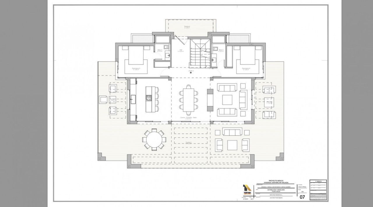 Set on a plot of 802m², the beautiful villa of 582 m² has been designed by renowned architect Pedro Iraburu Elizalde and offers high quality and spacious interior designed rooms with stunning and elegant interior design furniture and styling solutions. The villa is built over 3 levels. The ground floor consists of a large hallway with a guest toilet, an open plan living space that enjoys an abundance of natural light thanks to the large glass windows that open out onto the outdoor area. They lead to a private heated swimming pool, BBQ area as well as private sun loungers. The modern kitchen is fully equipped and has an island and breakfast area. Overlooking the garden,
