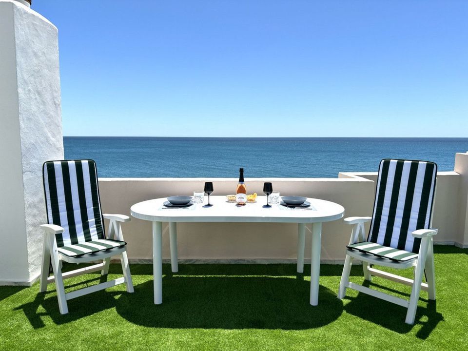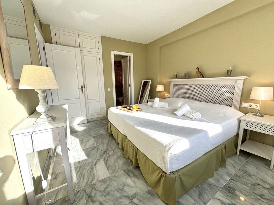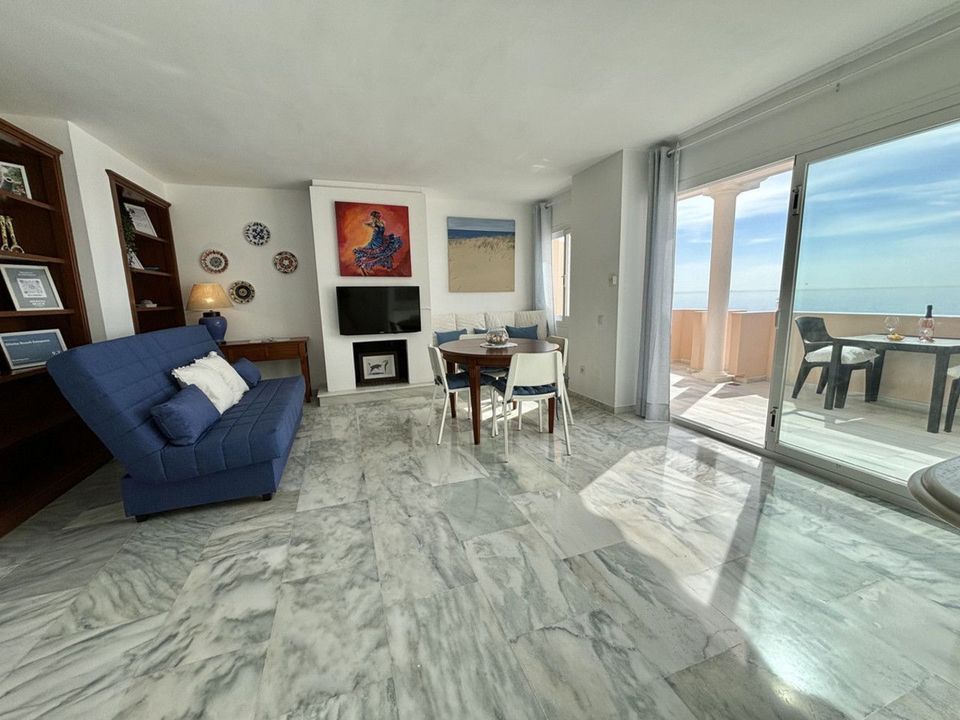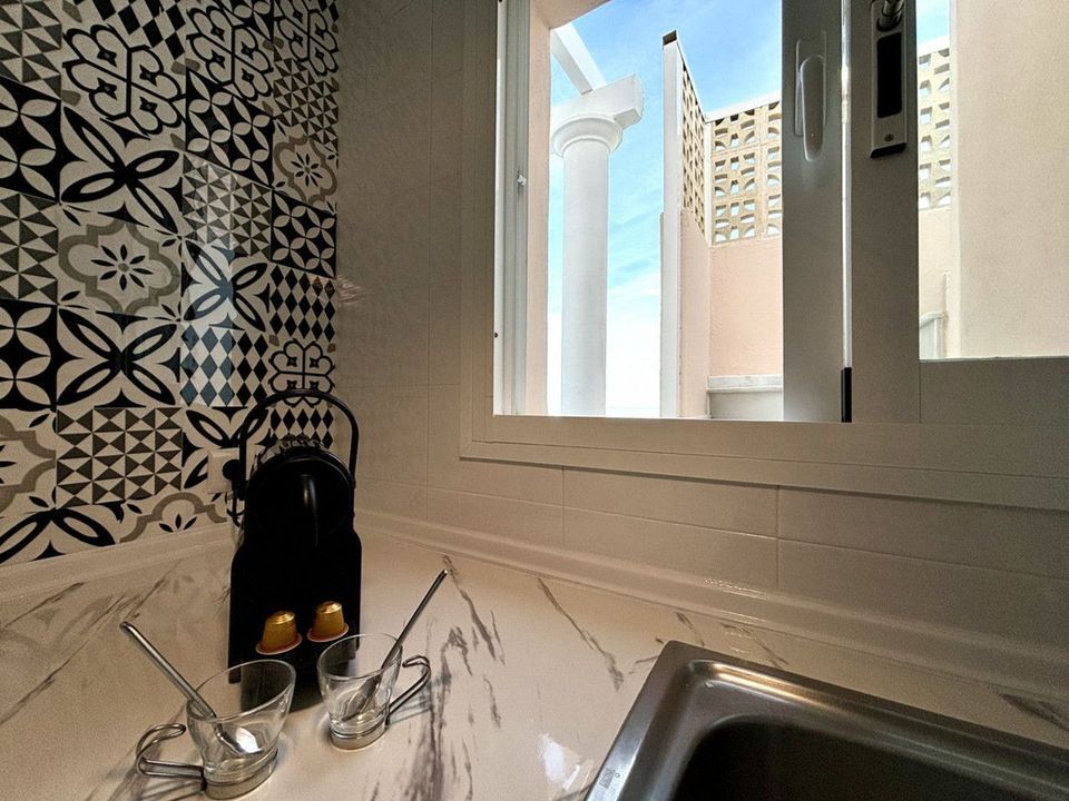 Het interieur van deze penthouse straalt elegantie en kwaliteit uit. De volledig uitgeruste keuken, voorzien van moderne apparatuur, gaat naadloos over in een ruime eet- en woonkamer, wat een ideale omgeving creëert voor zowel ontspanning als entertainment. Grote glazen deuren zorgen voor een overvloed aan natuurlijk licht en bieden directe toegang tot het privéterras, dat een panoramisch uitzicht biedt over de zee. De marmeren vloeren, in combinatie met details zoals ingebouwde kledingkasten en een inloopkast, benadrukken de luxueuze sfeer van het pand.