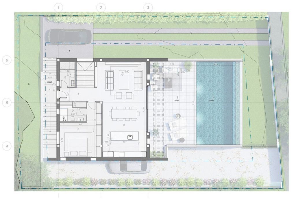 De moderne architectuur van de villa wordt gekenmerkt door strakke lijnen, een open indeling en een vloeiende overgang tussen de leefruimtes. Het hart van het huis is een stijlvolle designkeuken met hoogwaardige **Siemens-apparatuur**, die overloopt in een ruime woon- en eetkamer – perfect om te entertainen of om in alle rust te genieten.