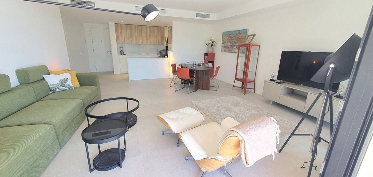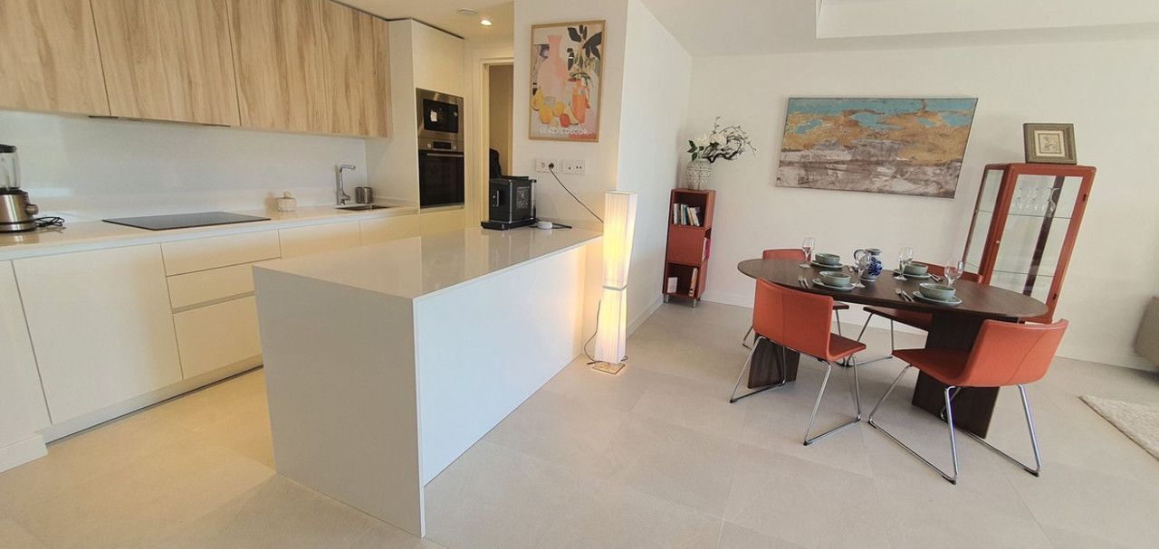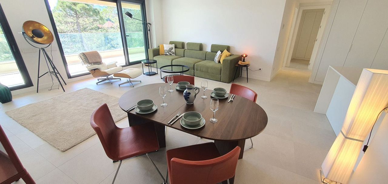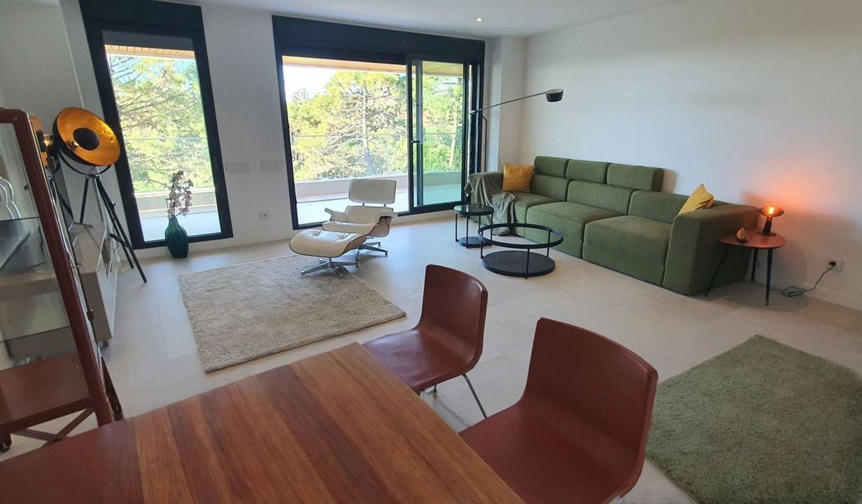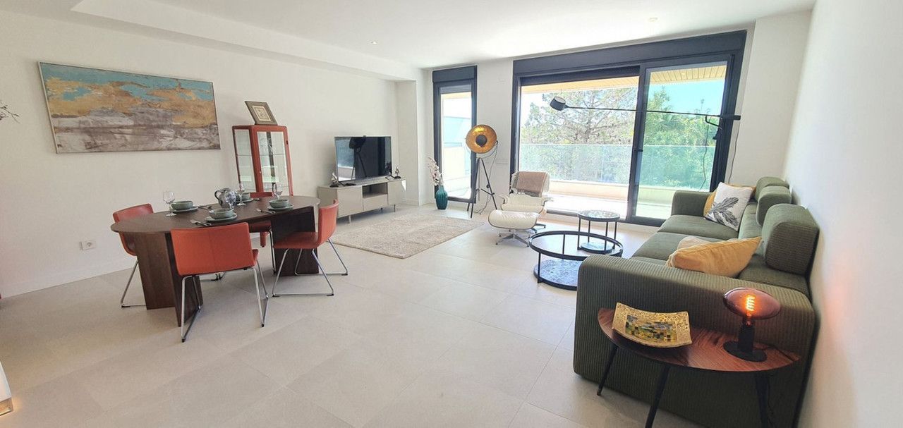The apartment features a spacious open-plan living and dining area that flows seamlessly onto a generous terrace, ideal for relaxing, entertaining, or enjoying sunset views to the sea. Large floor-to-ceiling windows enhance natural light and frame the surrounding greenery and coastline.