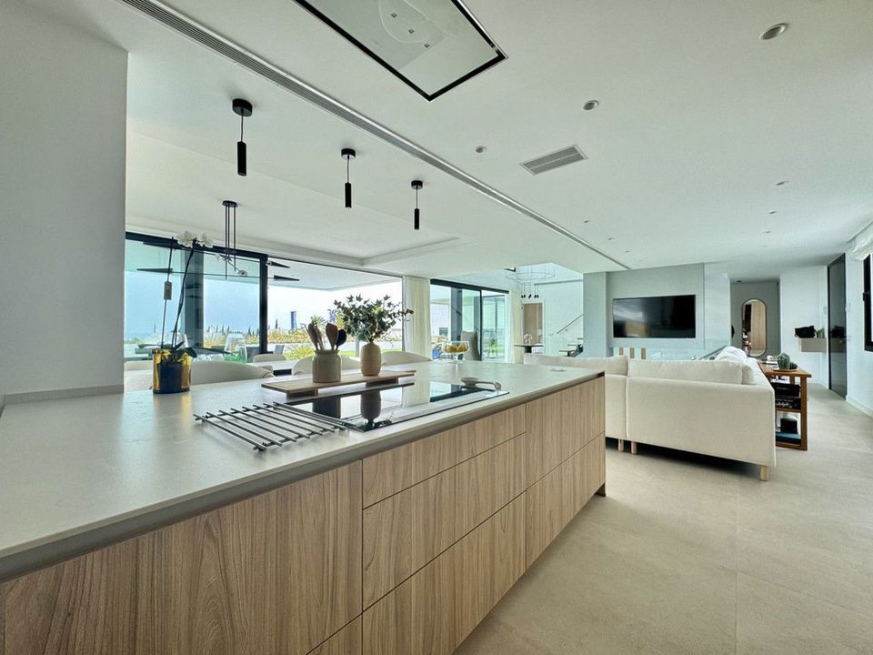 On the main floor, there is a spacious open-plan living area, decorated with minimalist taste and high-end finishes. From here, you have direct access to a covered terrace with a chill-out zone and a completely private pool, ideal for relaxing and enjoying the Mediterranean lifestyle.