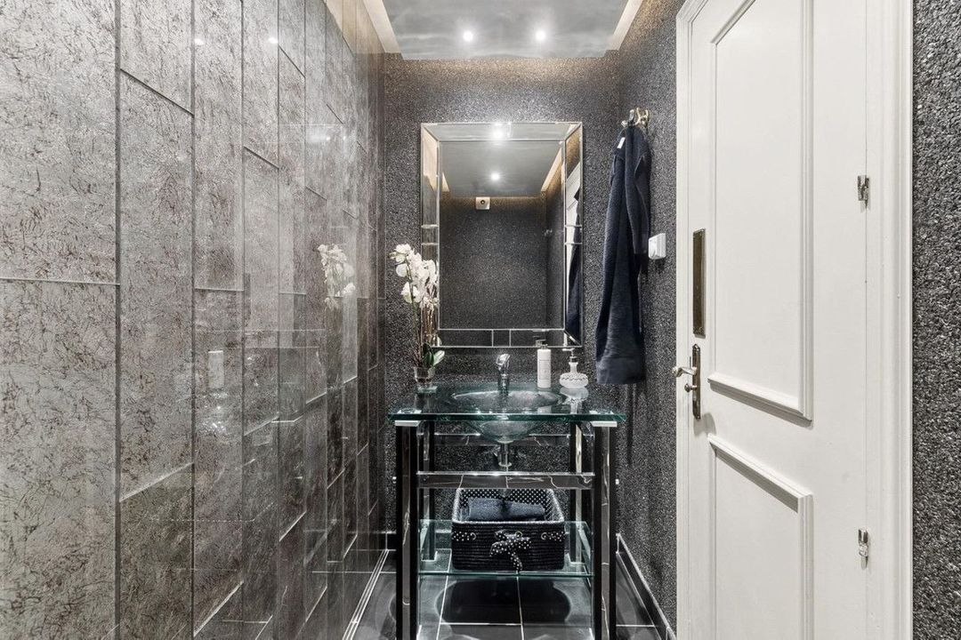 The modern, fully equipped kitchen boasts sleek design details with granite countertops and high-gloss black and red cabinetry, combining functionality with style.