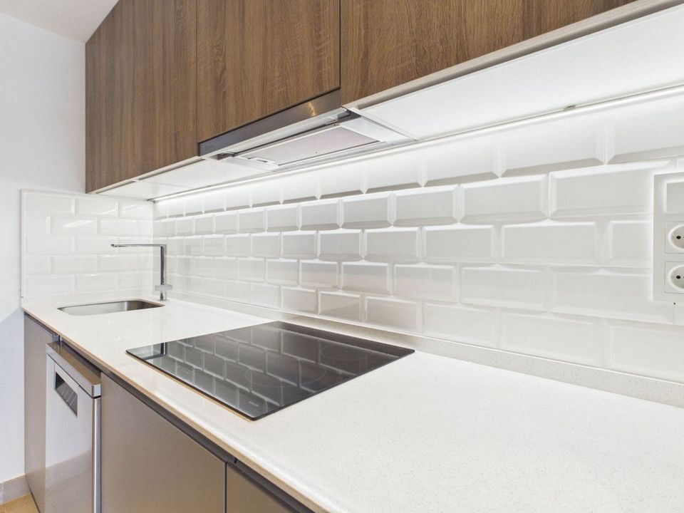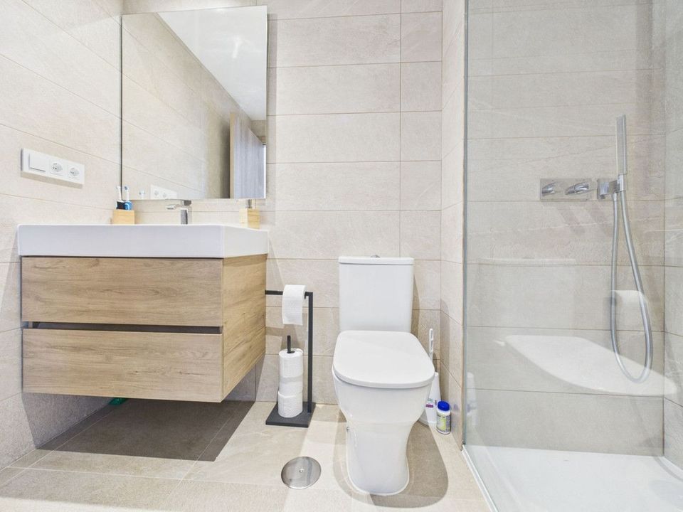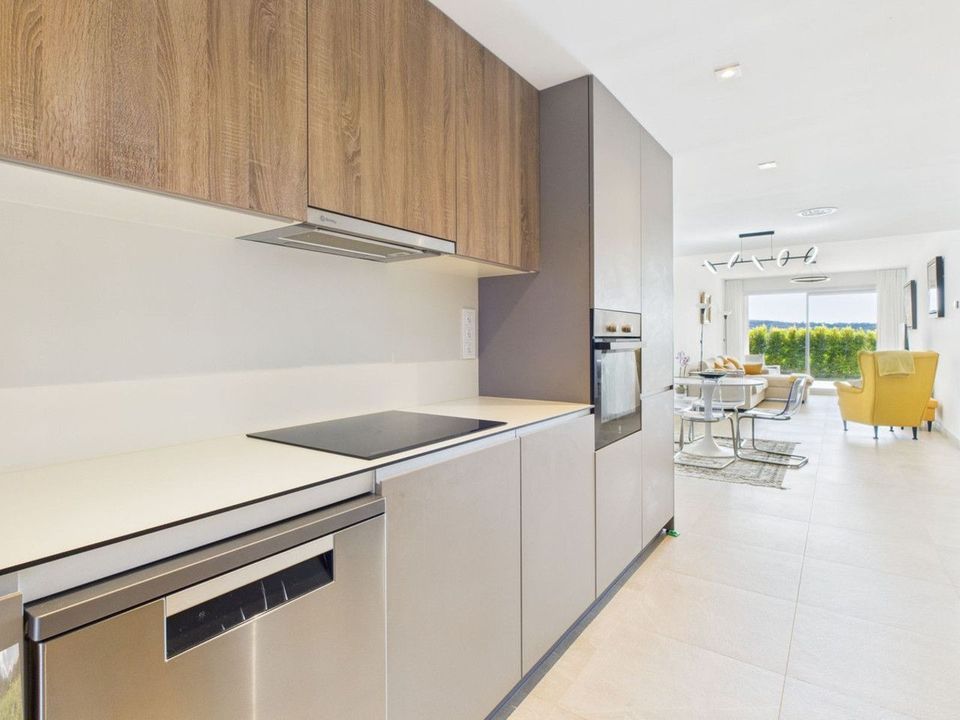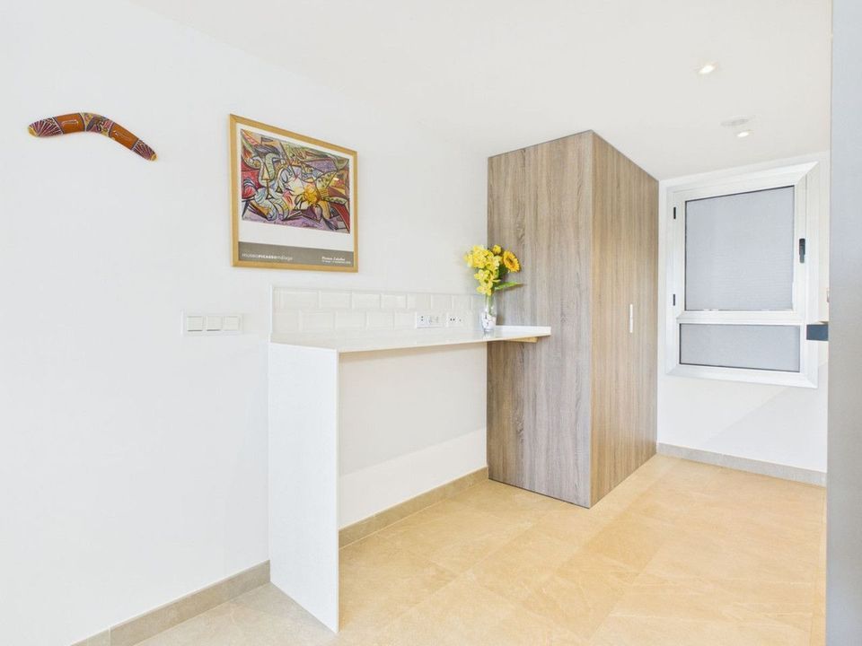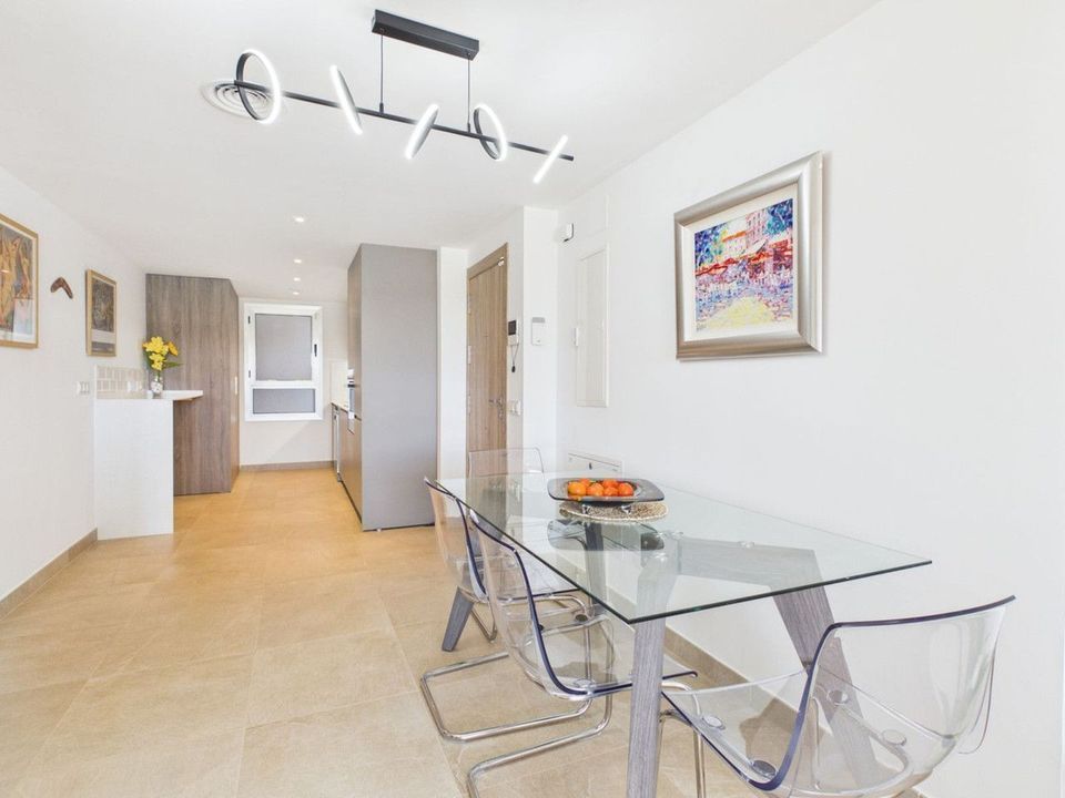 Completed in 2024, the apartment enjoys a bright and spacious open-plan layout, featuring a generous living and dining area that flows seamlessly onto a private terrace with garden and mountain views. With its southwest orientation, the property benefits from sunshine throughout the afternoon and spectacular sunsets over the surrounding hills.