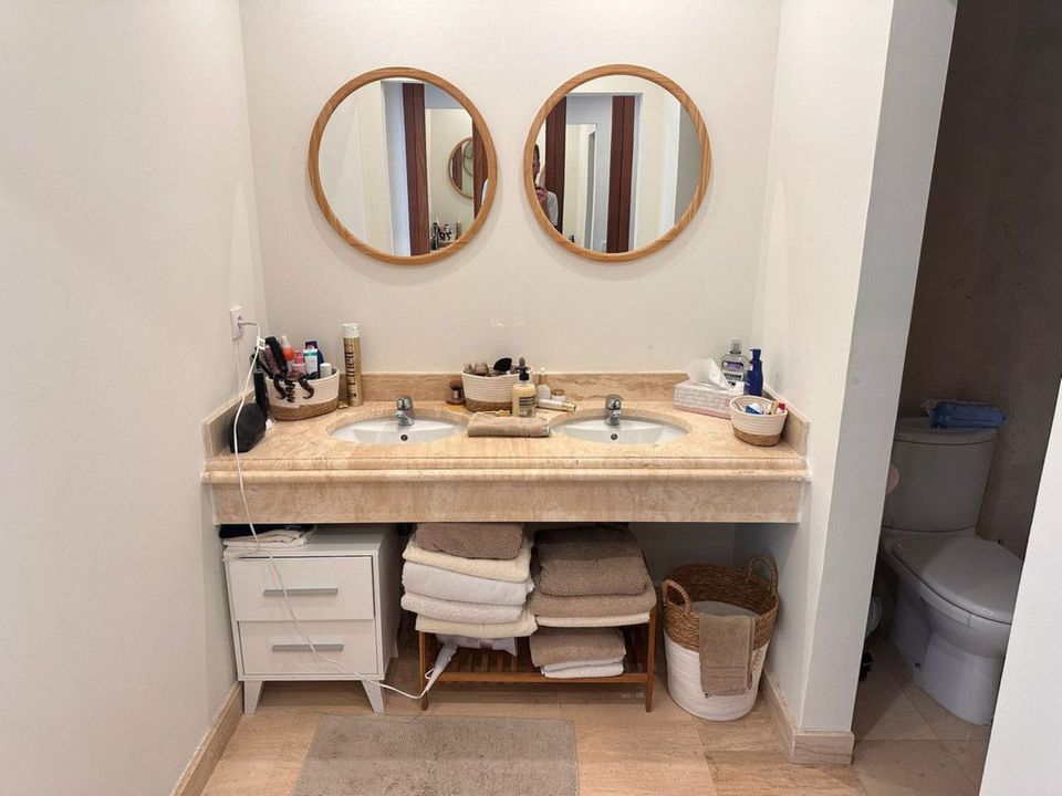 creme marble floors, marble bathrooms, double glazing, electric sun blinds, aircondition hot/cold, elevator, garage and storage room,