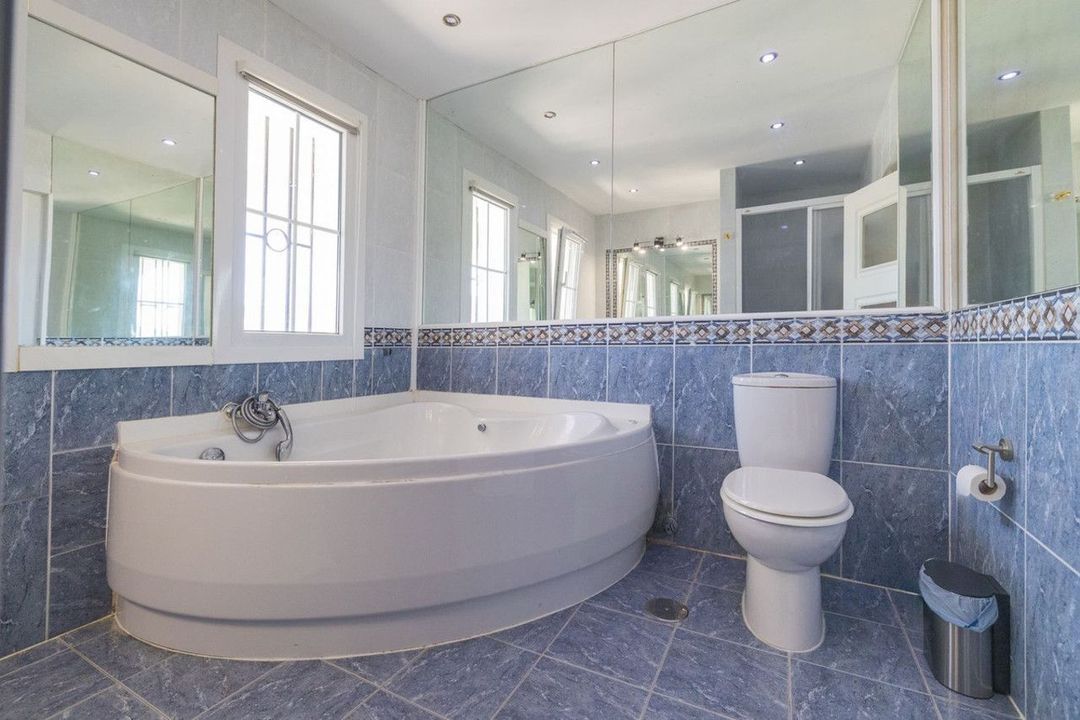 De begane grond huisvest vier slaapkamers, drie badkamers en een apart toilet, naast een semi-open keuken die naadloos aansluit op de tweede woonkamer. Deze woonkamer opent naar een zonovergoten terras met uitzicht op het sprankelende privézwembad en de luxueuze jacuzzi, waar u kunt genieten van de Spaanse zon en de serene omgeving. Daarnaast bevindt zich naast het zwembad een serre met een eetruimte en een zitruimte met een grote tv, perfect om naar voetbal of golf te kijken.