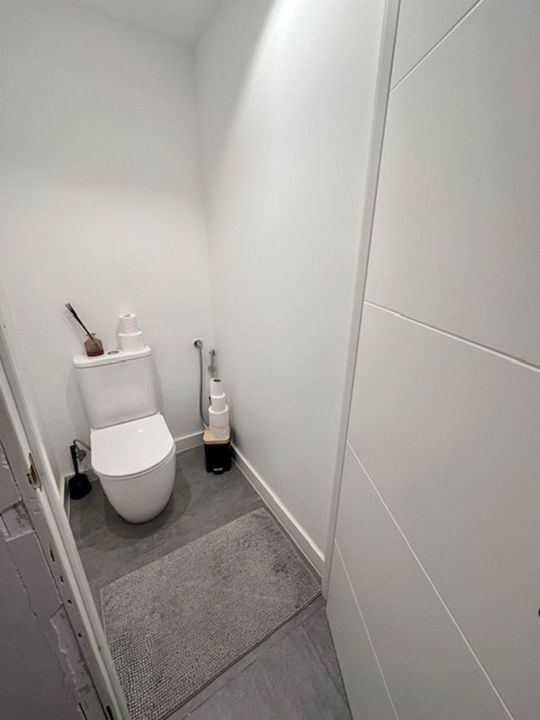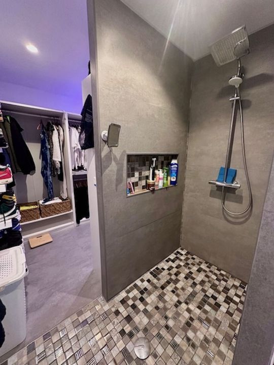 The master bedroom, ultra-modern, has been divided into two parts: a bathroom area with a shower, and a separate toilet area (his and hers).