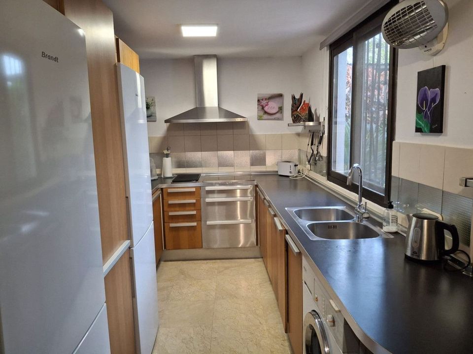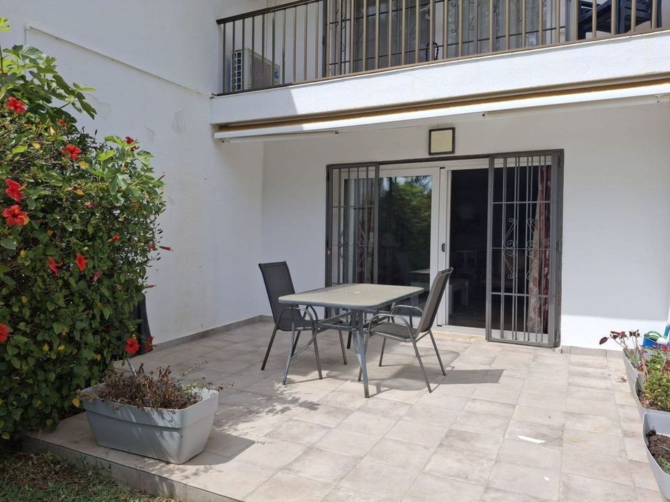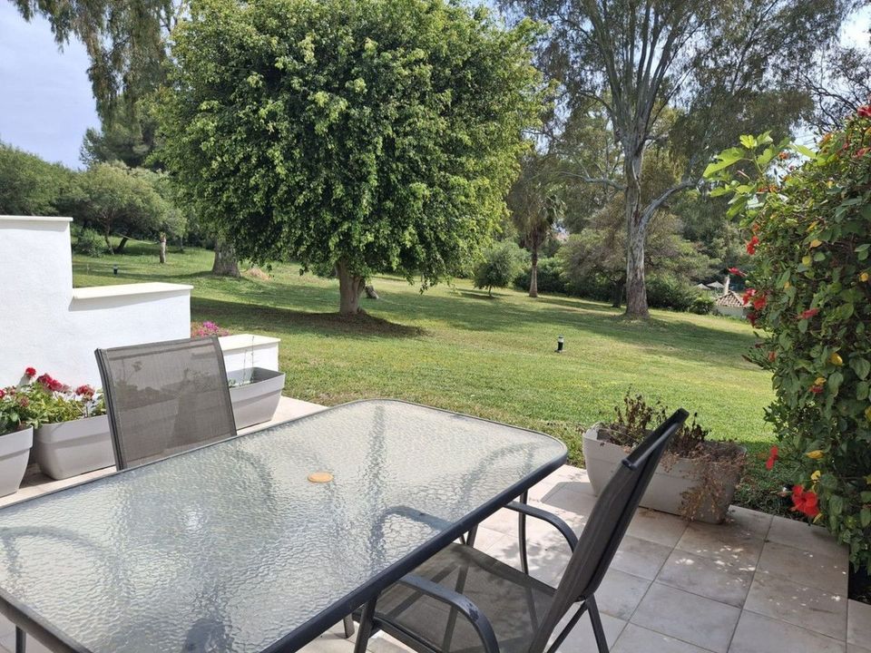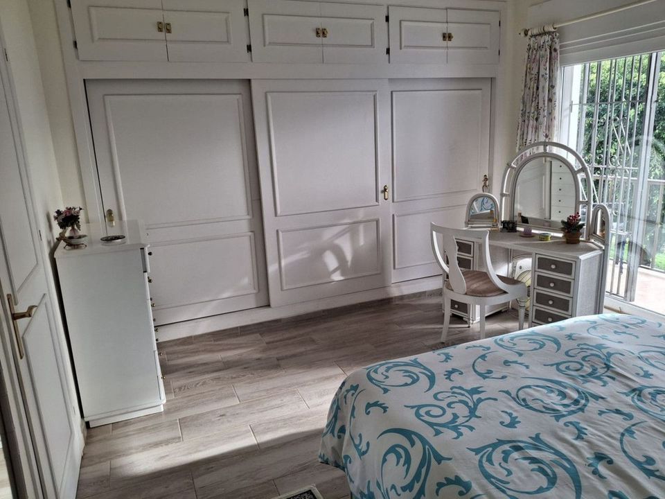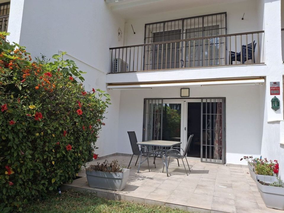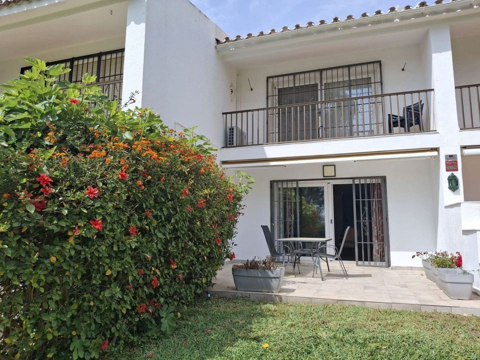Townhouse located in a small Andalucian pueblo style community in Nueva Atalaya. The property is situated in a quiet cul de sac close to all local amenities, shopping centre, schools and golf. The community boasts a large swimming pool and park sized landscaped gardens. This south facing house is built on 2 levels with an entrance hall, with a comfortable lounge-dining area and a modern kitchen on the ground floor. On the second floor it has 2 bedrooms, 2 bathrooms, one en-suite and two terraces. The lounge and terraces face onto the large communal gardens with a sea view from the main bedroom. The property is well presented with a modern kitchen, air conditioning and a fireplace with a log stove. Private parking directly in front of the house.