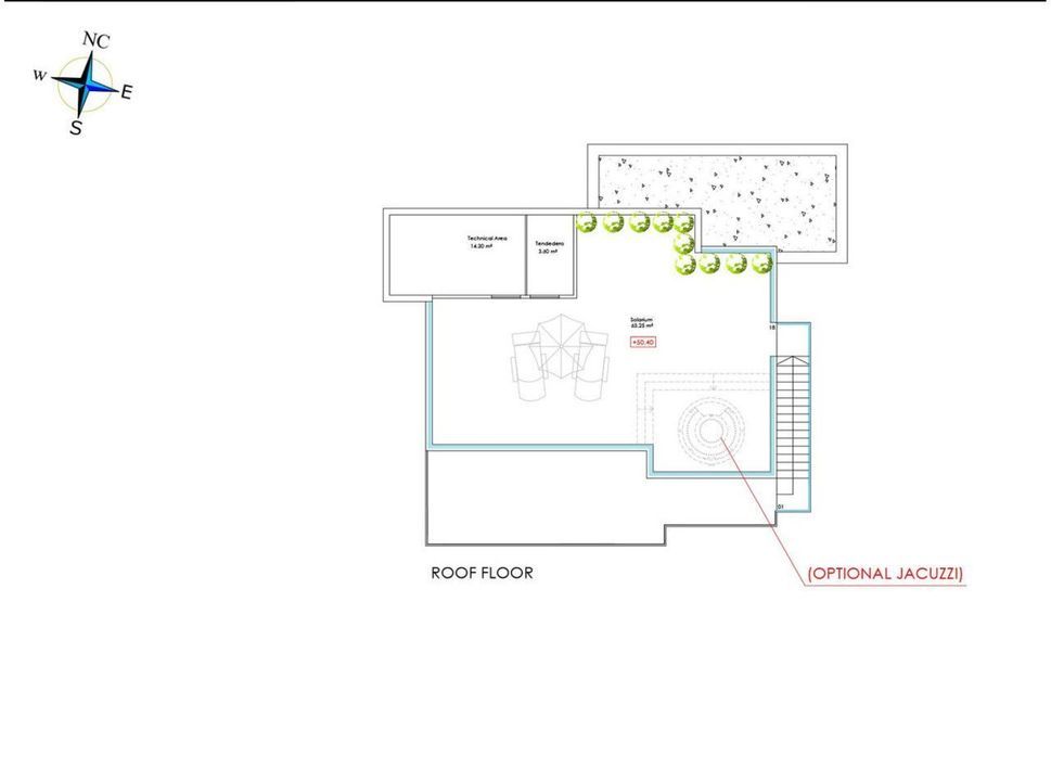 The roof floor offers a spacious solarium area with a pre-installation of a built-in Jacuzzi. There are some partial sea views from this level.