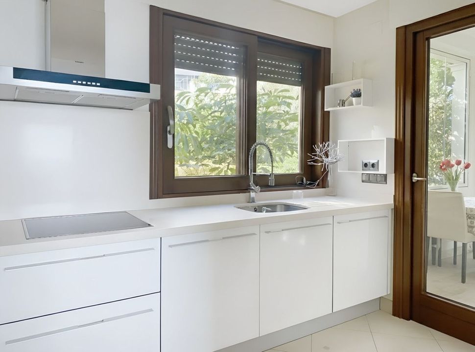 The contemporary kitchen, fully equipped, features SIEMENS appliances, Silestone countertops, a smoke detector, and a practical independent laundry room enclosed with glass windows, ideal for a private everyday dining area.