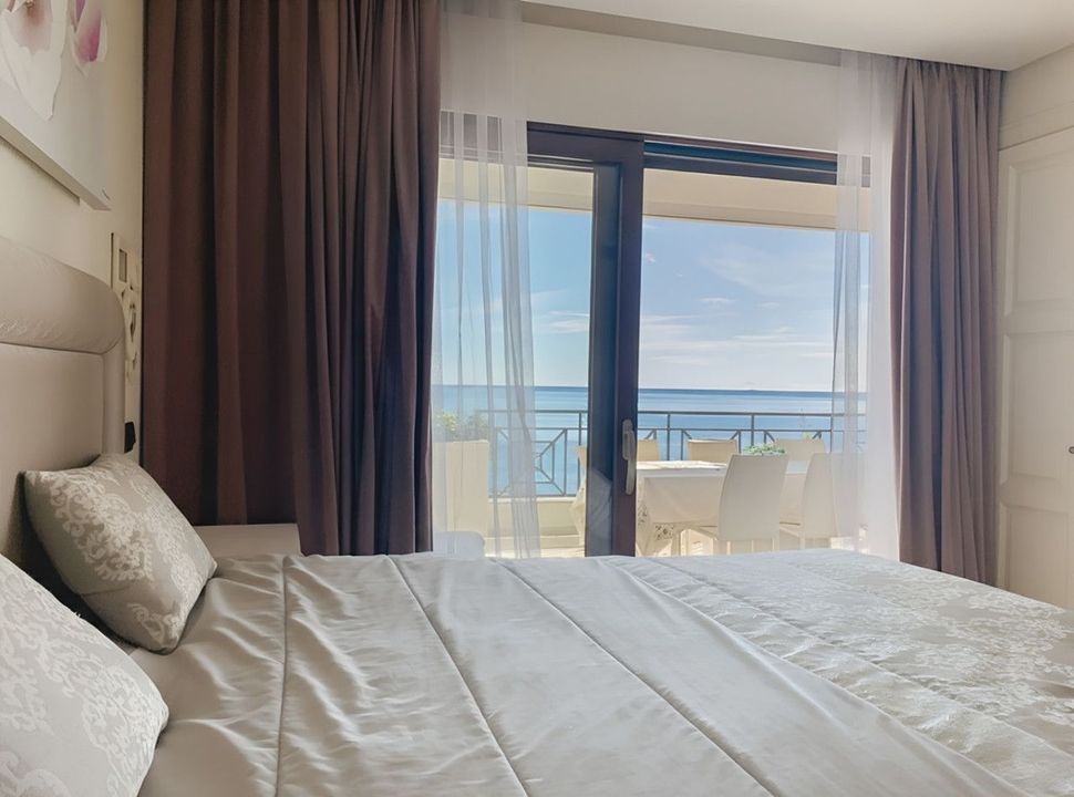 The apartment offers two bedrooms with en-suite bathrooms, conceived as private and comfortable spaces. The master suite enjoys sea views from the bed itself, direct access to the terrace, and includes a private bathroom with double sinks, a spacious shower, and an elegant whirlpool bathtub, making it a true haven of rest and well-being. The bathrooms are fitted with TRAVERTINO NAVONNA marble countertops, HANSGROHE faucets, and top-brand sanitary ware such as Jacuzzi and Duravit, reflecting a high level of detail and quality in every finish.