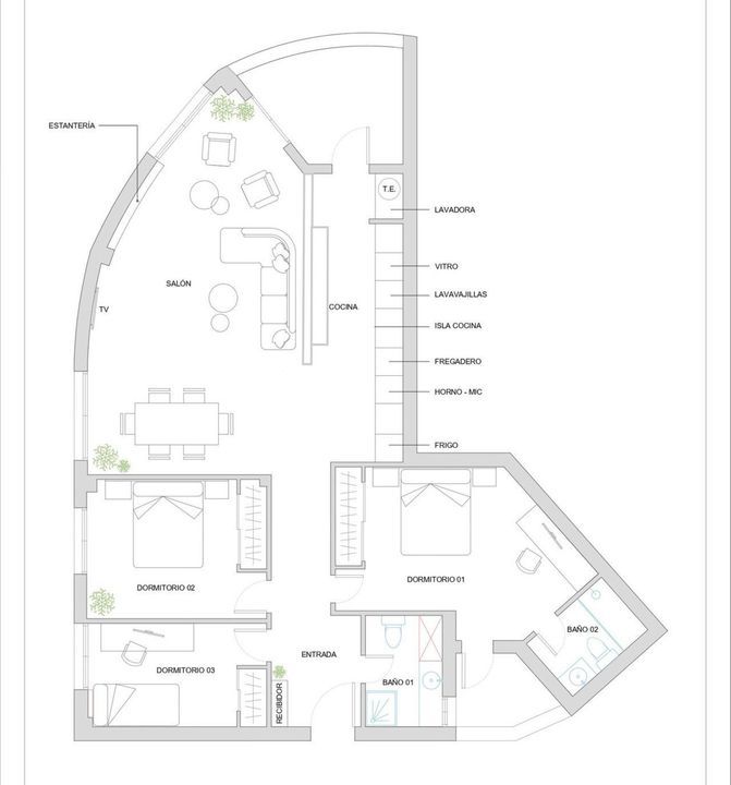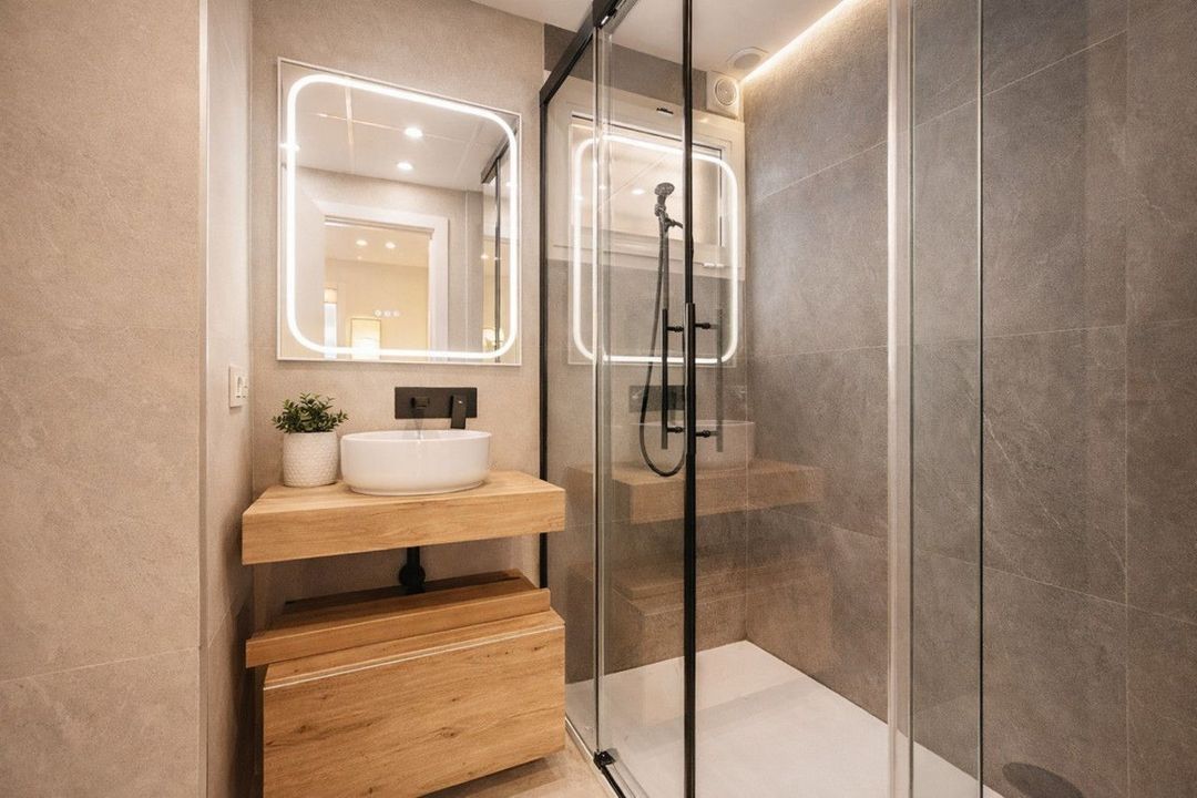 The apartment features three spacious bedrooms, all with new, lined, and illuminated built-in wardrobes, as well as ceiling fans and a powerful air conditioning system (8,000 frigories) that ensures maximum comfort throughout the year. The master bedroom has an en-suite bathroom with a modern shower and access to a balcony overlooking the interior of the complex, while the other two bedrooms—one currently used as a dressing room—share a second full bathroom. Both bathrooms stand out for their complete renovation with top-quality finishes, each featuring exterior windows that provide perfect ventilation. They include sliding glass shower screens designed to offer greater comfort and elegance.