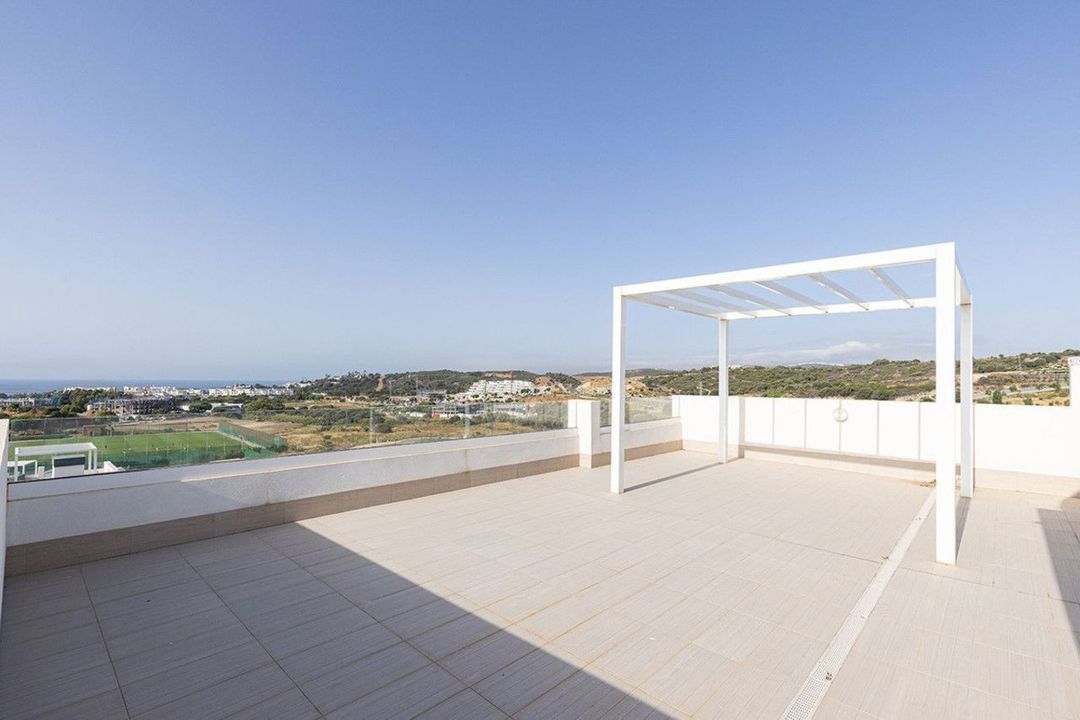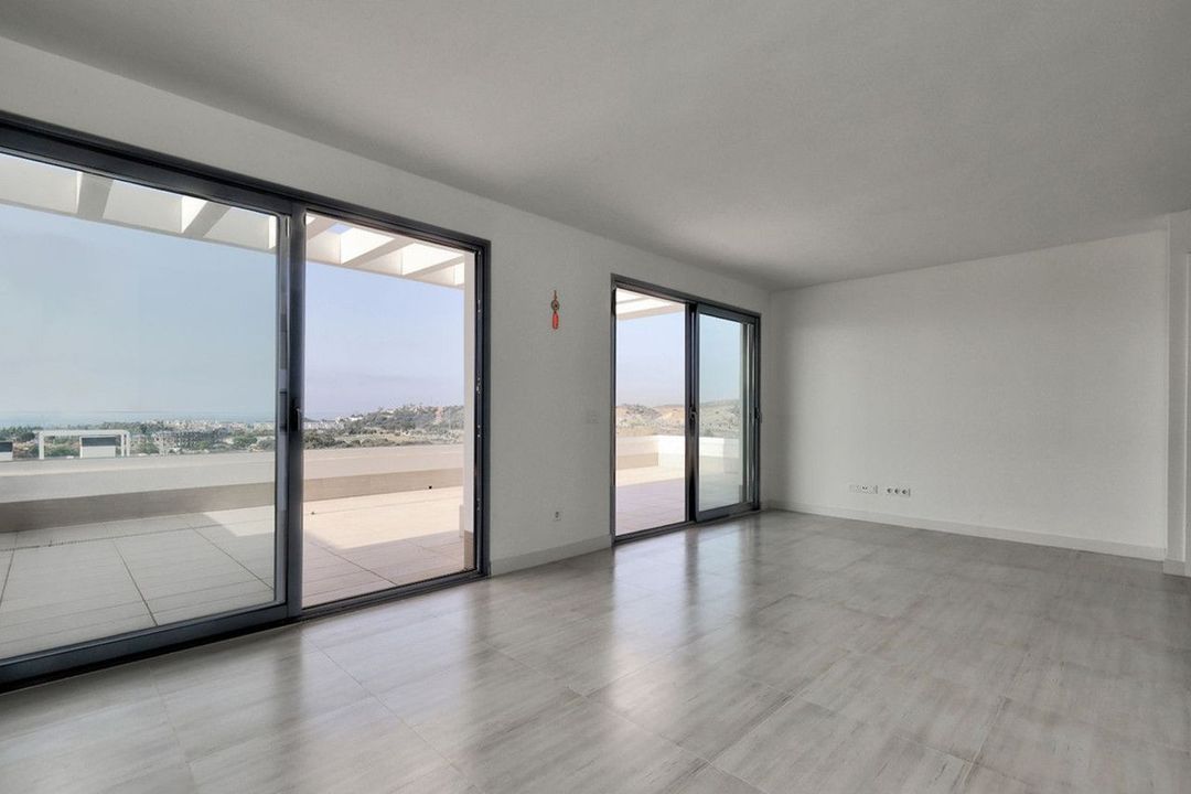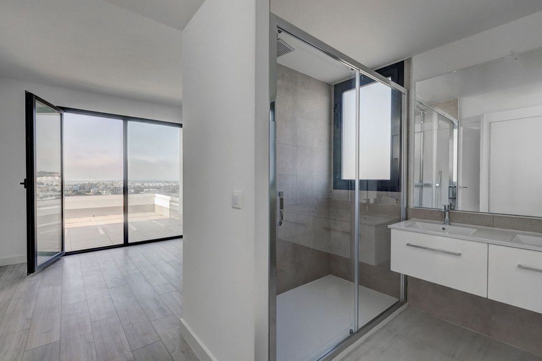 The entrance hall leads to the open plan fully equipped kitchen and a sunny living/dining room with large floor to ceiling sliding doors flowing effortlessly onto the very generously sized south-facing terrace and amazing roof top terrace, with breath-taking, panoramic views over the Mediterranean and African coast line.