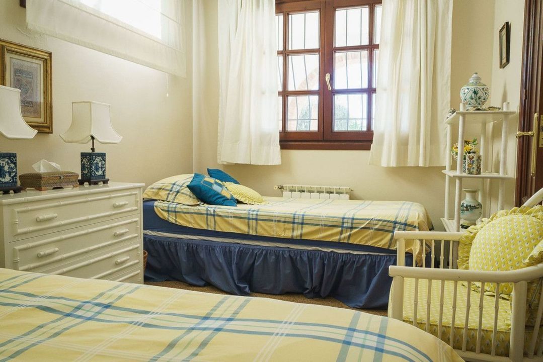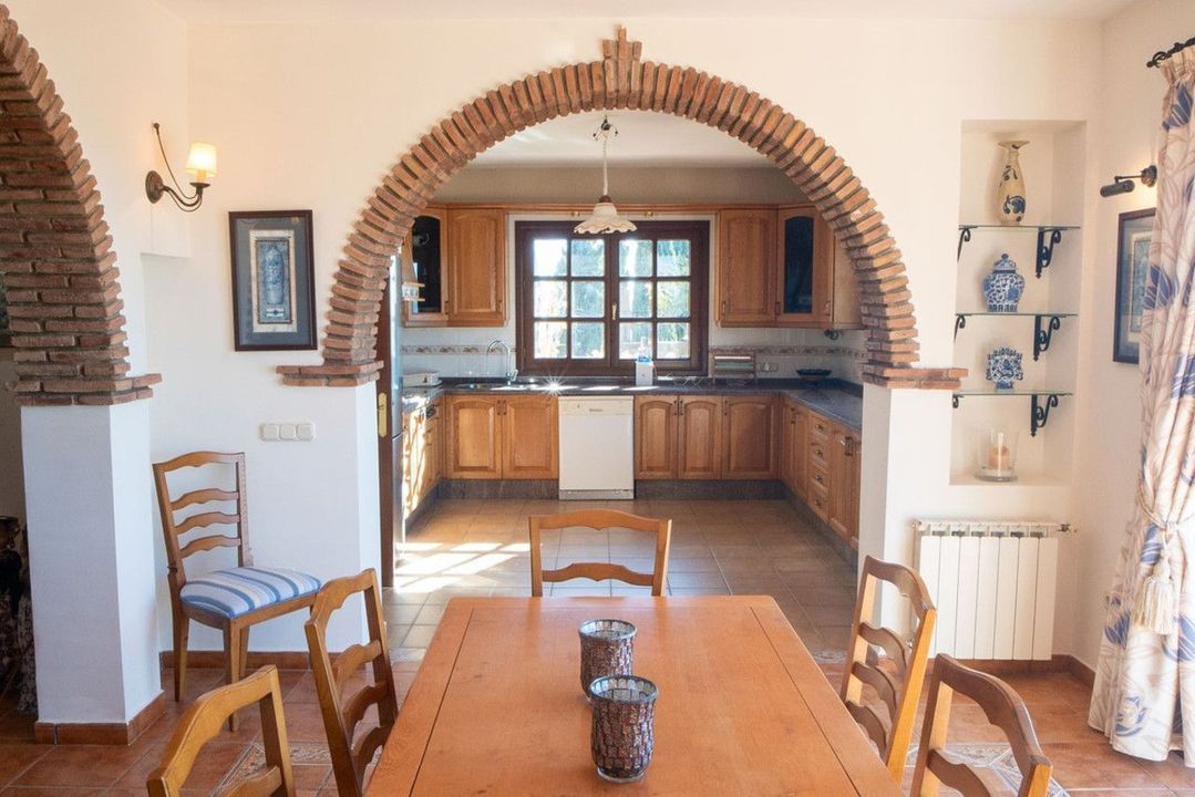 The lower level offers remarkable versatility. It currently features two large double bedrooms, one smaller bedroom, two separate shower rooms, and an open-plan sitting room with access to a covered terrace and the pool area. A secondary kitchen, added to what was once a storage room, transforms this level into a self-contained three-bedroom apartment—ideal for guests or extended family. The villa is equipped with oil heating and working fireplaces, ensuring comfort throughout the year.