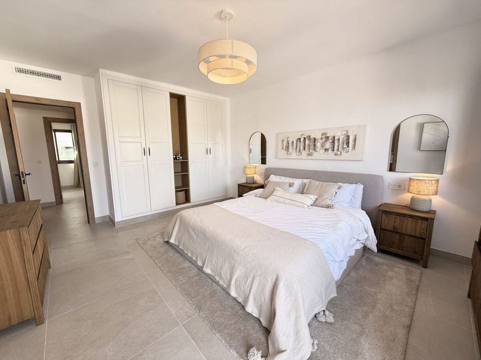 De master bedroom beschikt over een privéterras op de bovenverdieping met uitzicht op de golfbaan, de bergen en een glimp van de zee in de verte. Alle badkamers zijn volledig afgewerkt en uitgevoerd in een consistente, hoogwaardige stijl.