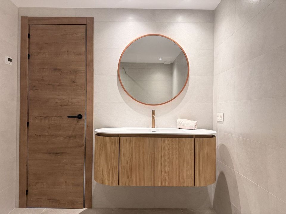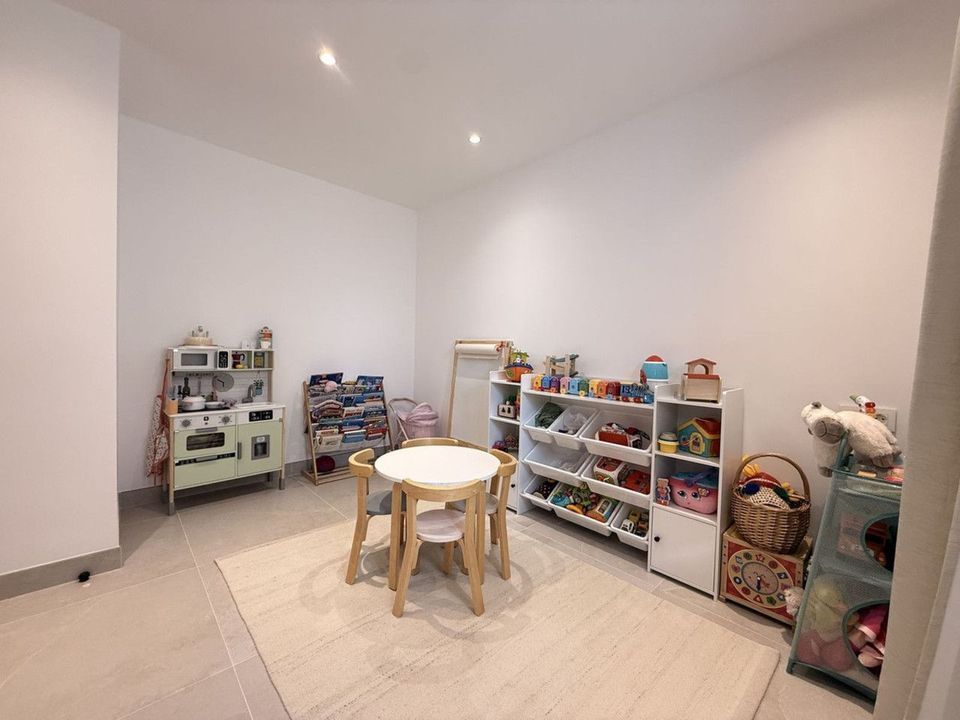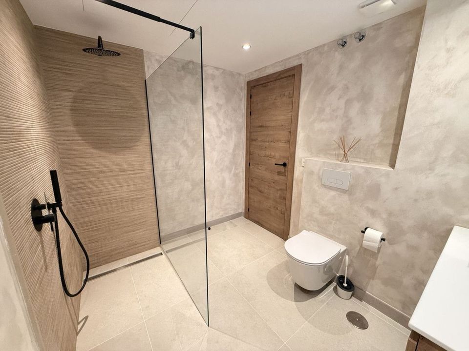 Hoogwaardige porseleinen vloeren lopen door de hele woning en zetten zich voort op de terrassen, wat het binnen-buiten wonen versterkt. Het ca. 20 m² grote terras op de begane grond met glazen schuifpanelen is het hele jaar door te gebruiken—open in de zomer of als extra leefruimte in de koelere maanden.