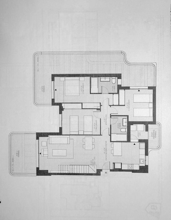 The main floor of the penthouse is designed for both comfort and practicality. The spacious living area benefits from porcelain floors, double glazing, and glass doors that open onto a private terrace, allowing natural light to flood the interior and providing urban and sea views. The open plan, fully fitted kitchen is equipped with modern appliances, a peninsula and includes a dedicated laundry room, making daily routines efficient.