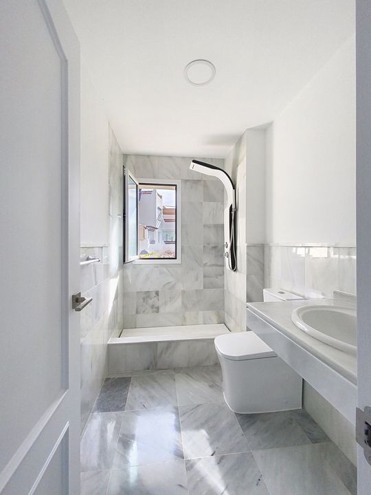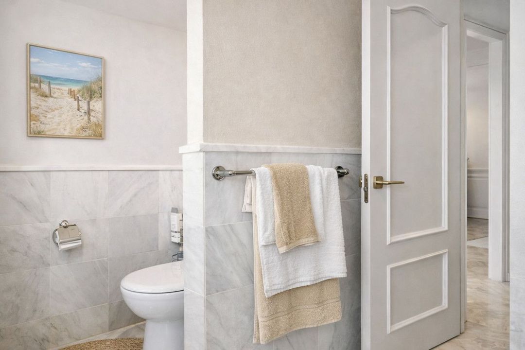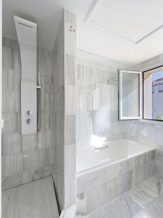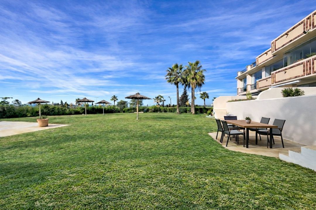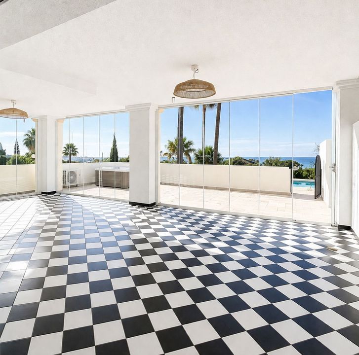 The property stands out for its generous 74 m² of terraces, a key feature for buyers searching for a ground floor apartment with large terrace in Estepona. The main covered terrace includes a Lumon-style glass curtain system, allowing year-round use as an extended living room in winter and a fully open outdoor space in summer. The expansive open terrace offers a private Jacuzzi, creating a true Costa del Sol outdoor lifestyle experience with direct access to communal gardens and a year-round swimming pool.